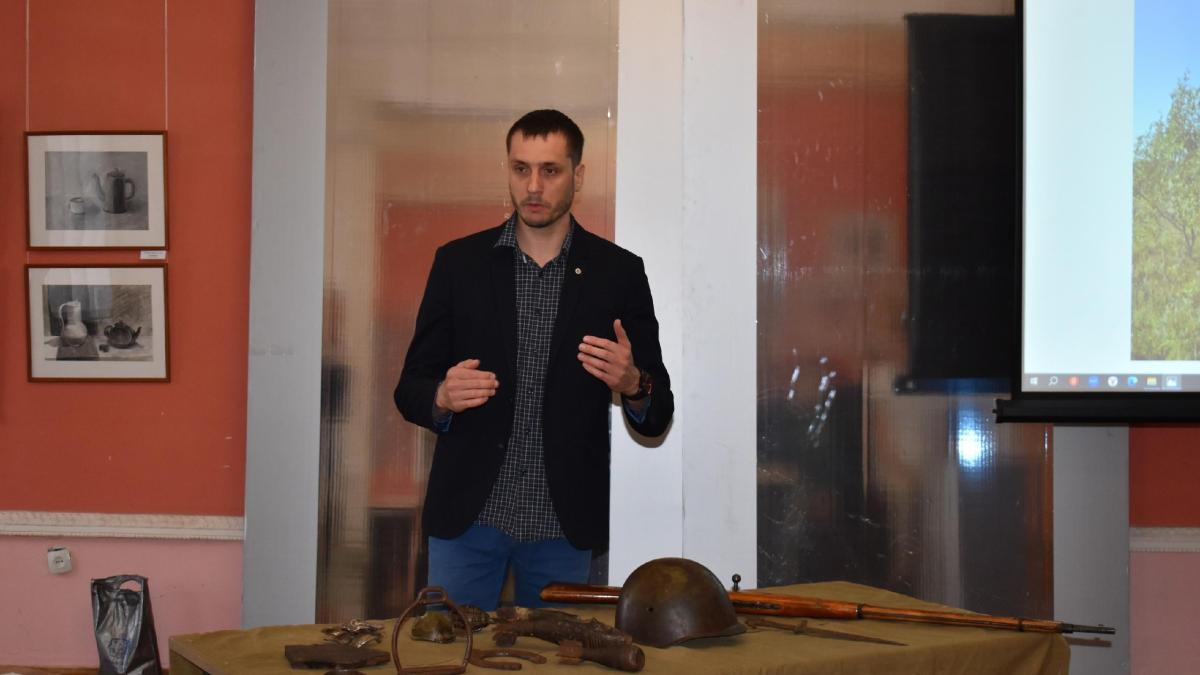 Руководитель штаба регионального отделения "Бессмертного полка России" в Рязанской области Алексей Царев рассказал ребятам о работе поисковых отрядов и формах увековечения памяти погибших при защите Отечества, о способах установления личности погибших солдат и командиров Красной армии. Познакомил с военными артефактами, которые были найдены на полях сражений Великой Отечественной войны.