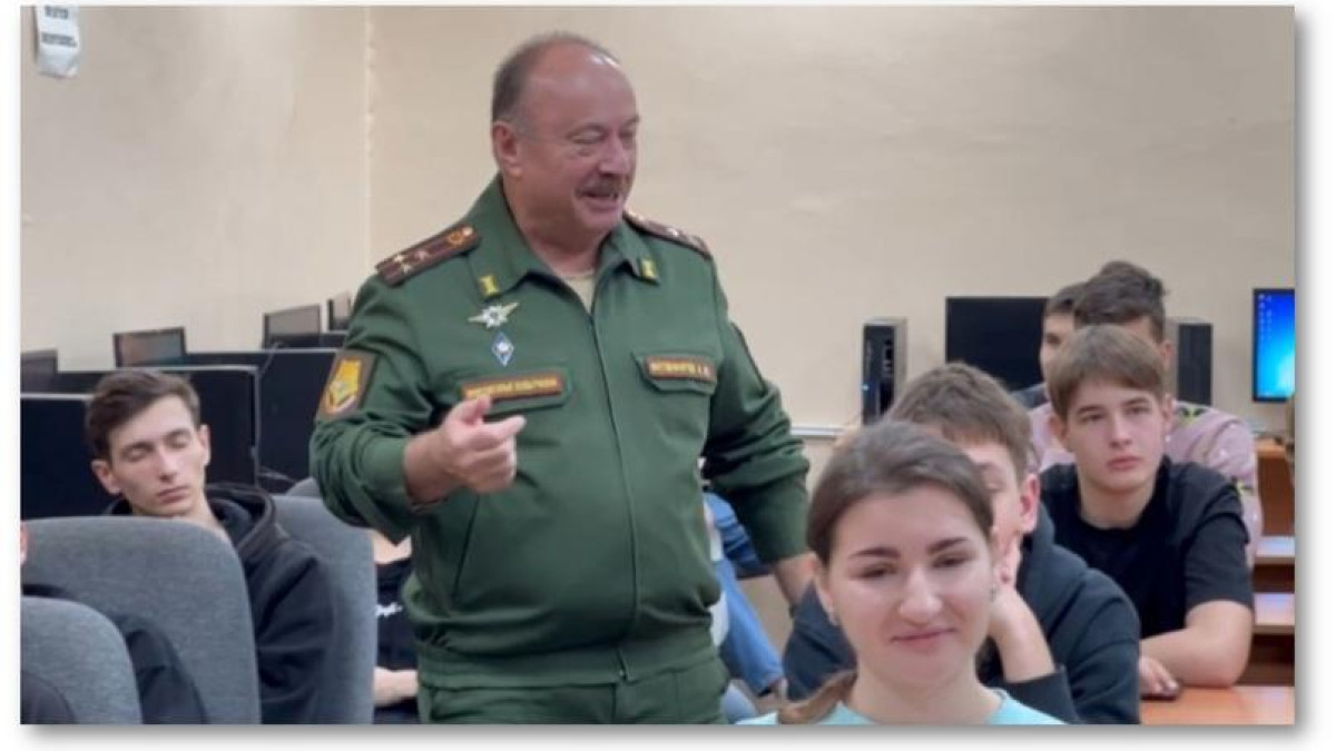 «Разговоры о важном» со студентами Сахалинского техникума строительства и жилищно-коммунального хозяйства провел руководитель штаба регионального отделения Бессмертного полка России полковник запаса Андрей Фугенфиров.