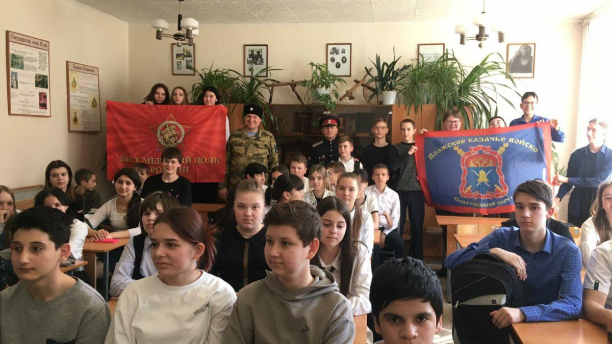 Продолжаются встречи участников специальной военной операции со школьниками. Вернувшийся в начале года из зоны боевых действий руководитель исполкома регионального отделения Бессмертного полка России в Саратовской области Андрей Бердников и заместитель атамана Волжского Казачьего войска Саратовской области Сергей Фролов проводят Уроки Мужества с демонстрацией трофеев.