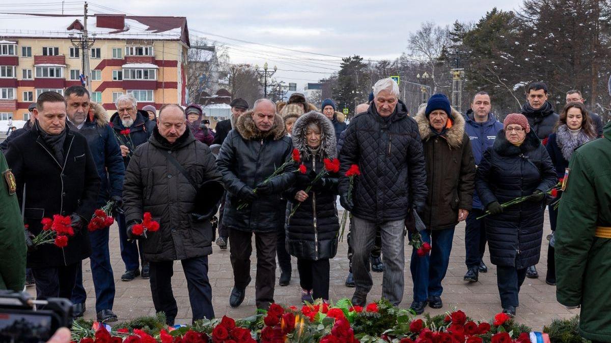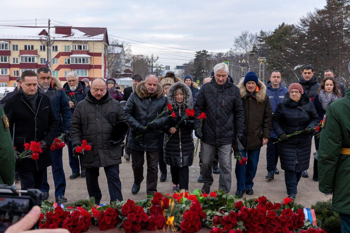 Сахалинские однополчане вместе с губернатором региона, общественными организациями и жителями Южно-Сахалинска возложили цветы к Вечному огню цветы в память о героях, павших в боях за Родину. Память героев страны почтили минутой молчания, после которой прозвучал Гимн России в исполнении военного оркестра Южно-Сахалинского гарнизона и оружейный салют.