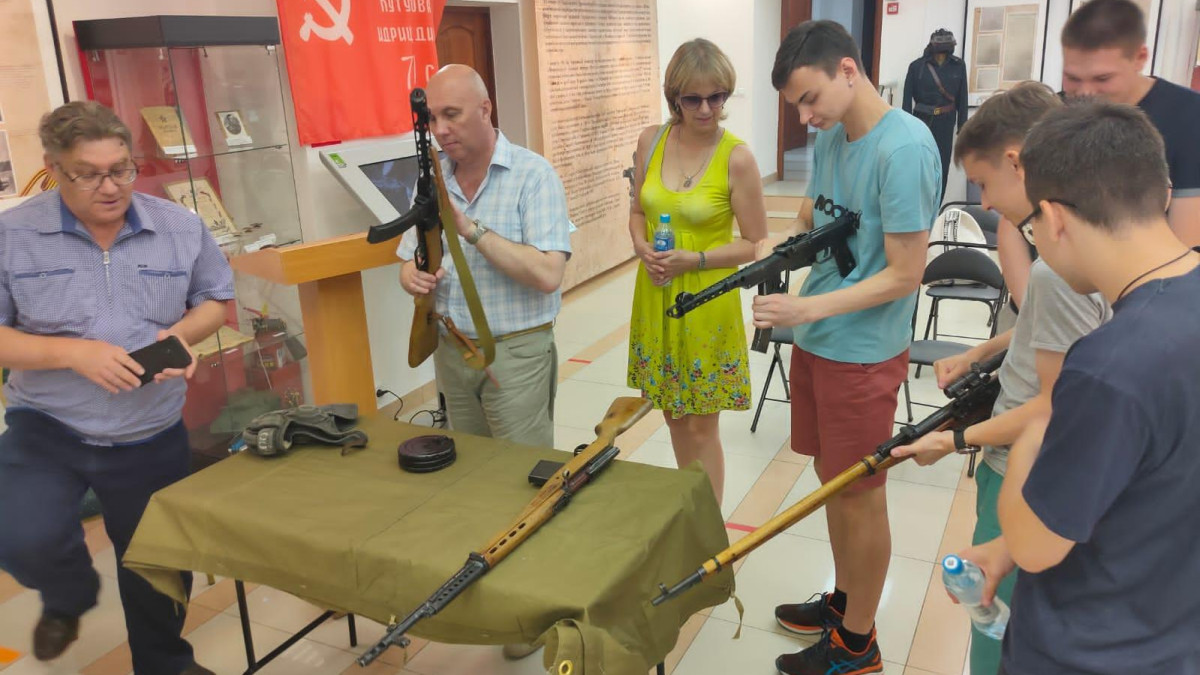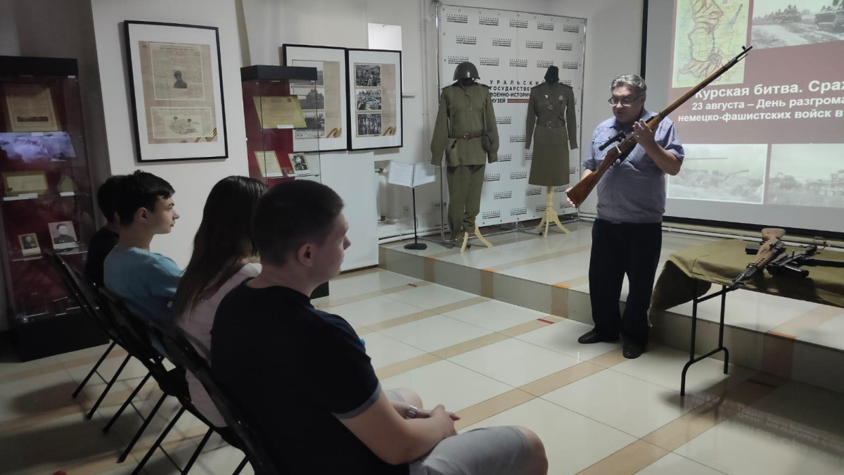 Также в музее ребят ожидала культурно-просветительская программа, посвященная 80-летию начала Курской битвы. Исторический экскурс в событие помог совершить методист музея - подполковник в отставке, ветеран железнодорожных войск Игорь Лындин. Также гости познакомились с экспозицией, посвященной боевому пути Уральского добровольческого танкового корпуса, сражению на Курской дуге, смогли взять в руки образцы стрелкового вооружения Красной Армии.