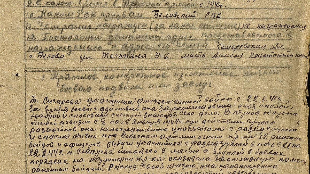 В наградном листе значатся такие слова: «Товарищ Сигарёва в боях с 27.8.43 года по 6.9.43 года в районе деревни Лядцо, Пречистое, Подлипки, Берёзовка и ряд других населённых пунктов Смоленской области проявила себя, как мужественная, смелая патриотка своей Родины, вынесла с поля боя 30 раненых бойцов и командиров с их оружием. 5.9. 43г. в районе деревни Ляды Ельнинского района Смоленской области товарищ Сигарёва под сильным пулемётно-ружейным огнём противника оказывала помощь раненым, в это время она заметила приближающихся трёх немцев. Схватив винтовку, уничтожила их и снова продолжила оказывать помощь раненым…»