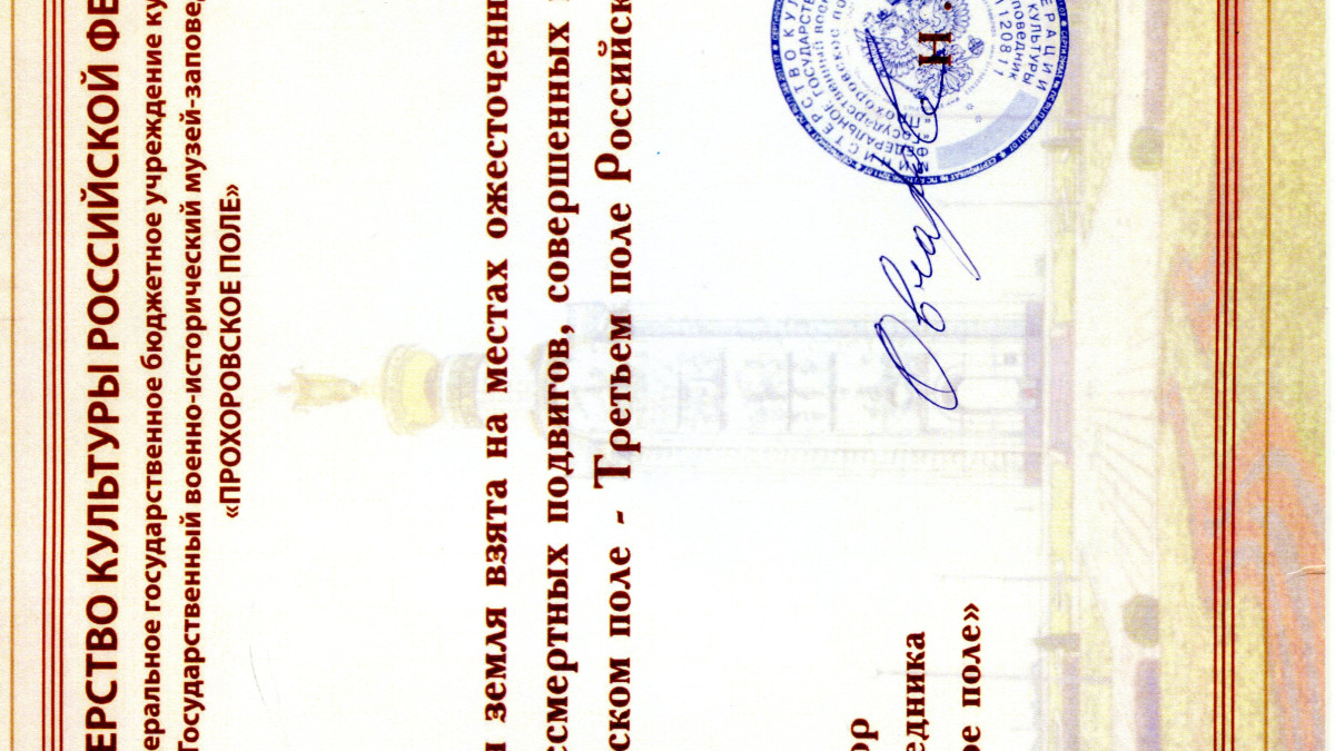 «Священной землёй поделились с нами челябинские коллеги, которые привезли её с поля битвы. Правда, предназначалась она для вручения из рук в руки самому ветерану Курской битвы. Не успели… Теперь она будет вместе с ним навечно. Остальная часть священной земли вместе с сертификатом передана на хранение в местный музей», – сказал Геннадий Кириллович.