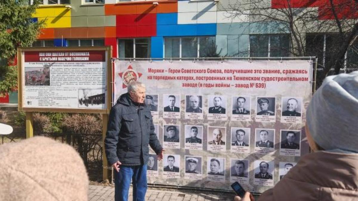 В Тюмени прошло мероприятие, посвященное Тюменскому судостроительному заводу: уже известный баннер, размещенный по адресу ул. Республики, 51, обновили. Теперь его украшают лица моряков, ставших Героями Советского Союза во время службы на торпедных катерах с Тюменского судостроительного завода в годы Великой Отечественной войны. На открытии баннера присутствовали бывший сотрудник завода Юрий Андреев, родственники его коллег, представители власти города и общественные движения.