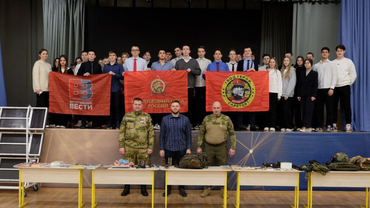 «Урок мужества» для учащихся 8-11 классов 34-й гимназии Саратова провели руководитель исполкома регионального отделения Бессмертного полка России в Саратовской области, член общественного совета при Саратовской областной думе и участник СВО Андрей Бердников совместно с волонтером ассоциации «Твои герои, Саратов!» Дмитрием Молоковым.