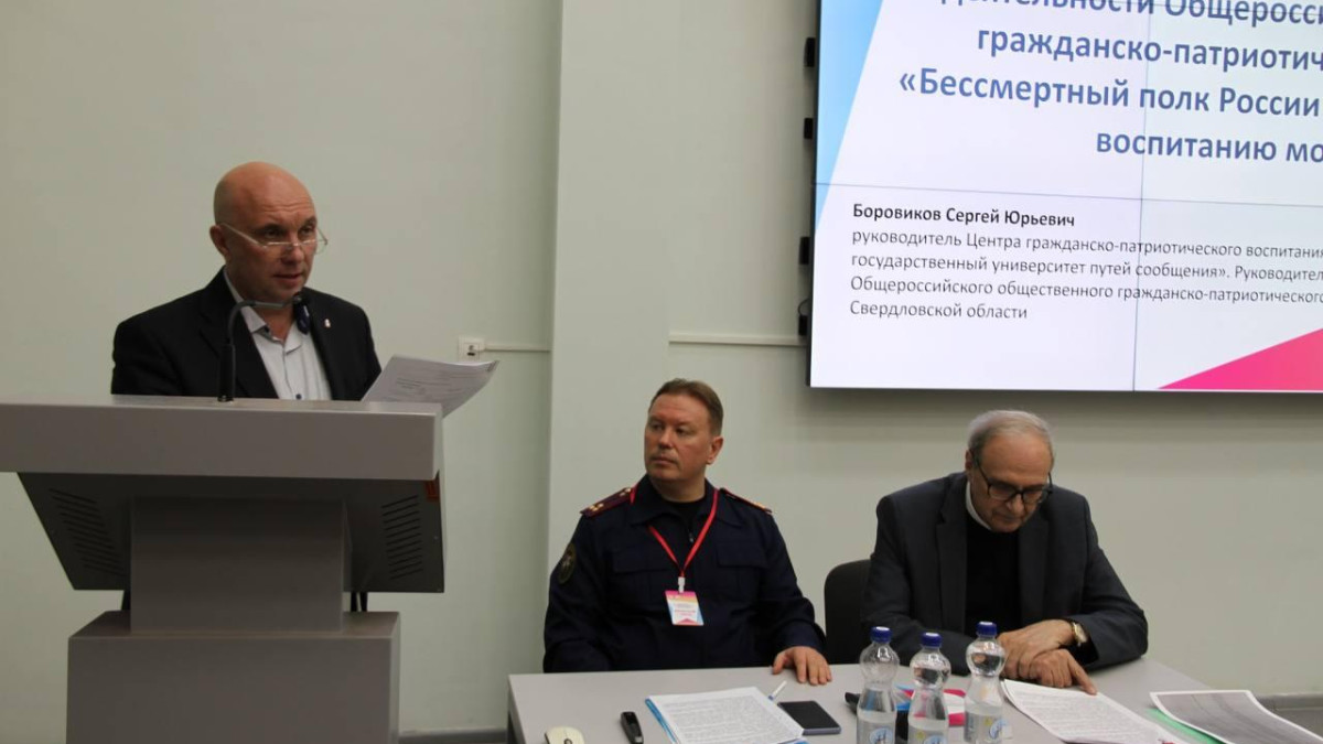 На круглом столе были рассмотрены актуальные практики патриотического воспитания молодежи силами правоохранительных органов региона, ветеранскими, поисковыми, военно-патриотическими и другими общественными организациями. Руководитель штаба регионального отделения Движения в Свердловской области, руководитель Центра гражданско-патриотического воспитания молодежи УрГУПС Сергей Боровиков рассказал о проектах, реализуемых Бессмертным полком России, доложил о запланированных мероприятиях, посвященных 80-летию Победы в Великой Отечественной войне.