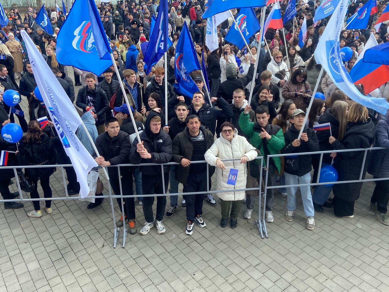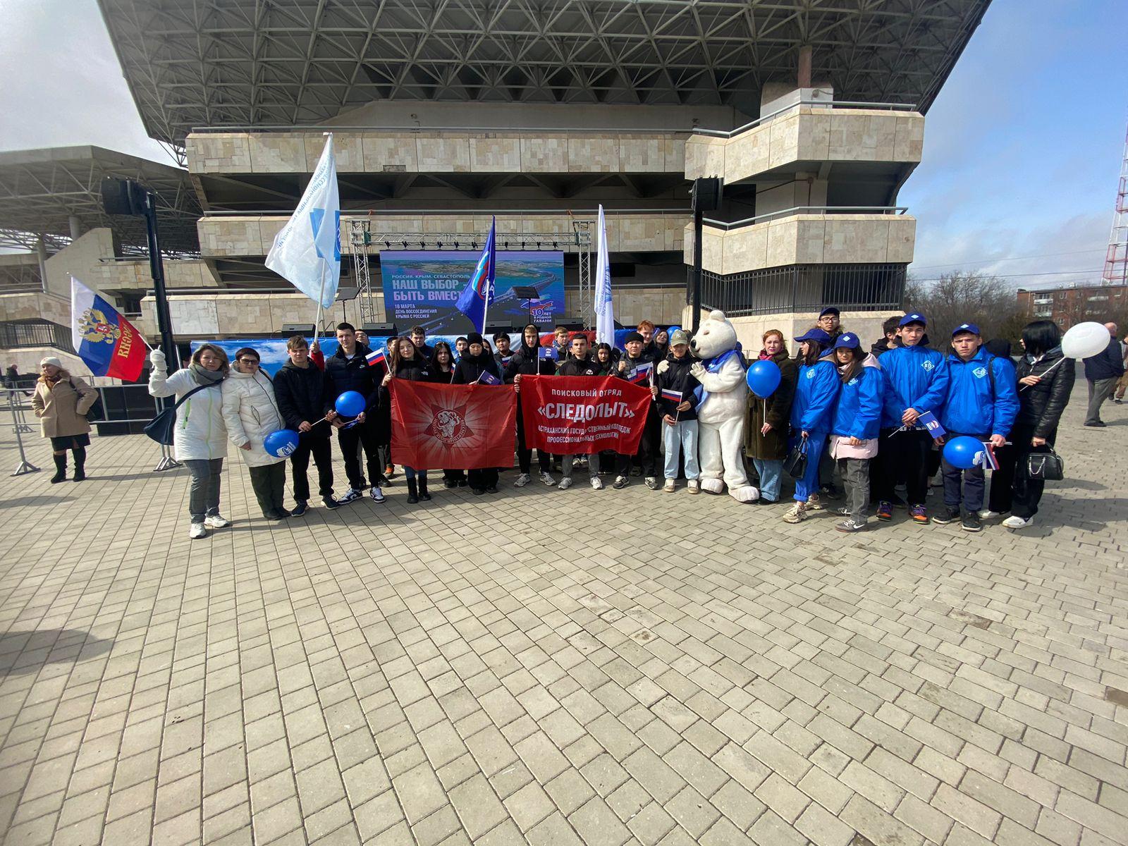 Члены штаба регионального отделения ООД «Бессмертный полк России» в Астраханской области присоединились к митингу-концерту, который состоялся в АДК «Аркадия» в честь 10-й годовщины воссоединения Крыма и Севастополя с Российской Федерацией.