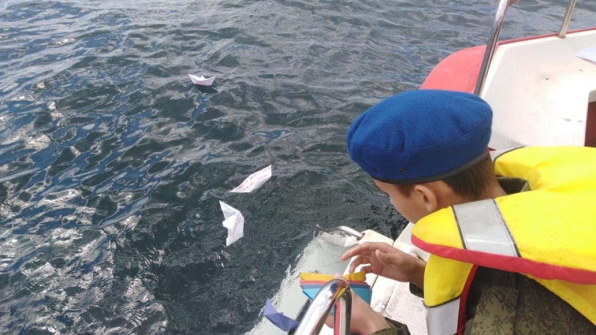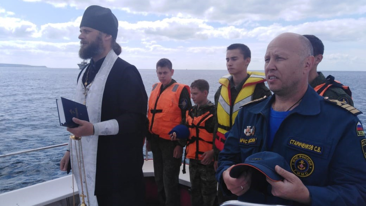 Перед тем, как ребята вместе с сотрудниками ГИМС спустили на воду кораблики, священнослужитель провел службу о погибших воинах. Выход в море, на рейд порта Невельск, был совершен на катере ГИМС МЧС.