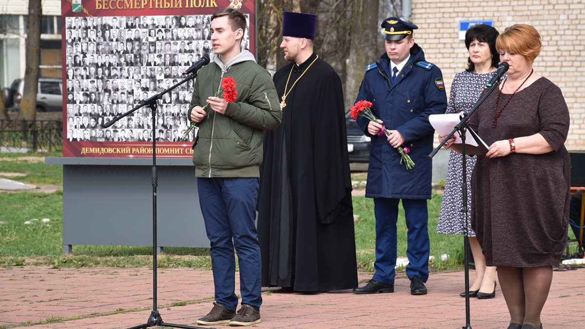 В торжественном открытии мемориального стенда приняли участие заместитель руководителя исполкома регионального отделения ООД «Бессмертный полк России» в Смоленской области, руководитель проекта «Бессмертный полк Смоленщины - истории Победителей» Никита Зуев, заместитель главы муниципального образования «Демидовский район» Татьяна Крапивина, прокурор Демидовского района Максим Смирнов. В ходе торжественного открытии Благочинный Демидовского округа протоиерей Александр Миронов освятил стенд.