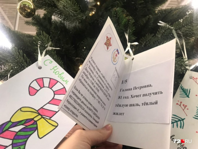 Судя по открыткам, взрослые чаще всего хотят получить тёплые вещи и продуктовые гостинцы. Тюменцы могут порадовать их, взяв открытку с ёлки и передав подарки волонтёрам. Если человек забирает открытку, но не приносит подарок, через три дня добровольцы восстанавливают её, чтобы никто из детей и пенсионеров не остался без исполненного новогоднего желания.