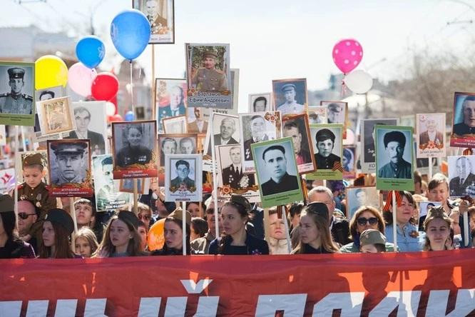 Граждане с гордостью несли по центральным улицам города и областным населённым пунктам портреты своих дедов и прадедов, участвовавших в различных оборонительных и наступательных операциях 1941-1945 годов.