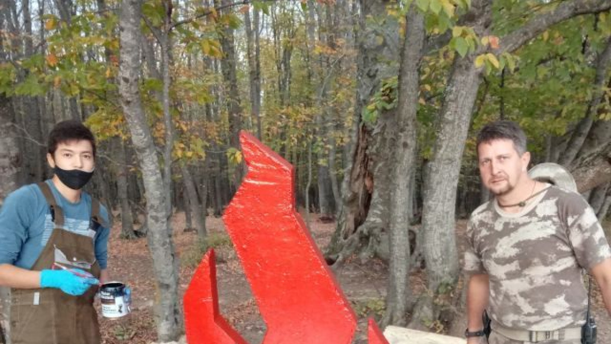 Далее волонтеры отправились на Долгоруковскую яйлу, чтобы отремонтировать два памятника Северному соединению крымских партизан. За выходные они привели в надлежащее состояние памятник "Путник" на границе, обозначающей начало "партизанских мест", и объект "Пламя", установленный около бывшей партизанской стоянки.