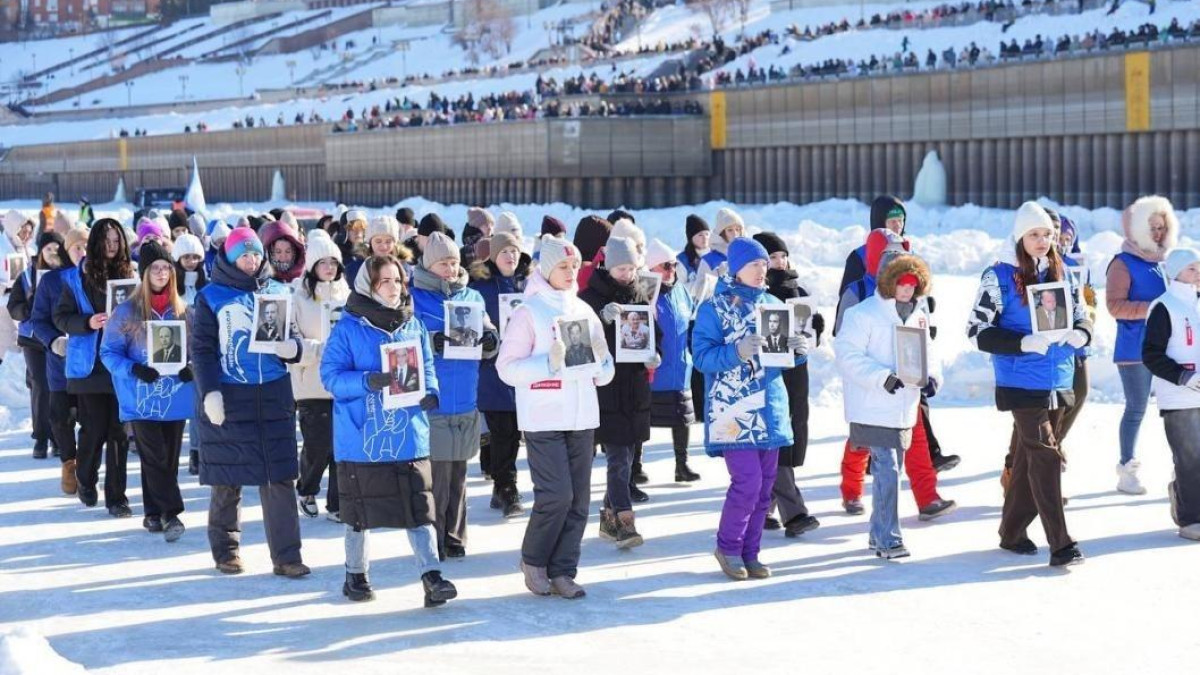 В Тюмени День защитника Отечества отметили шествием, Бессмертный полк впервые провели на #СпецоперацииЛед. Горожане прошли по льду Туры с портретами 130 тюменцев-героев Великой Отечественной войны. Во главе колонны на портретах были портреты 32 ныне здравствующих ветерана.