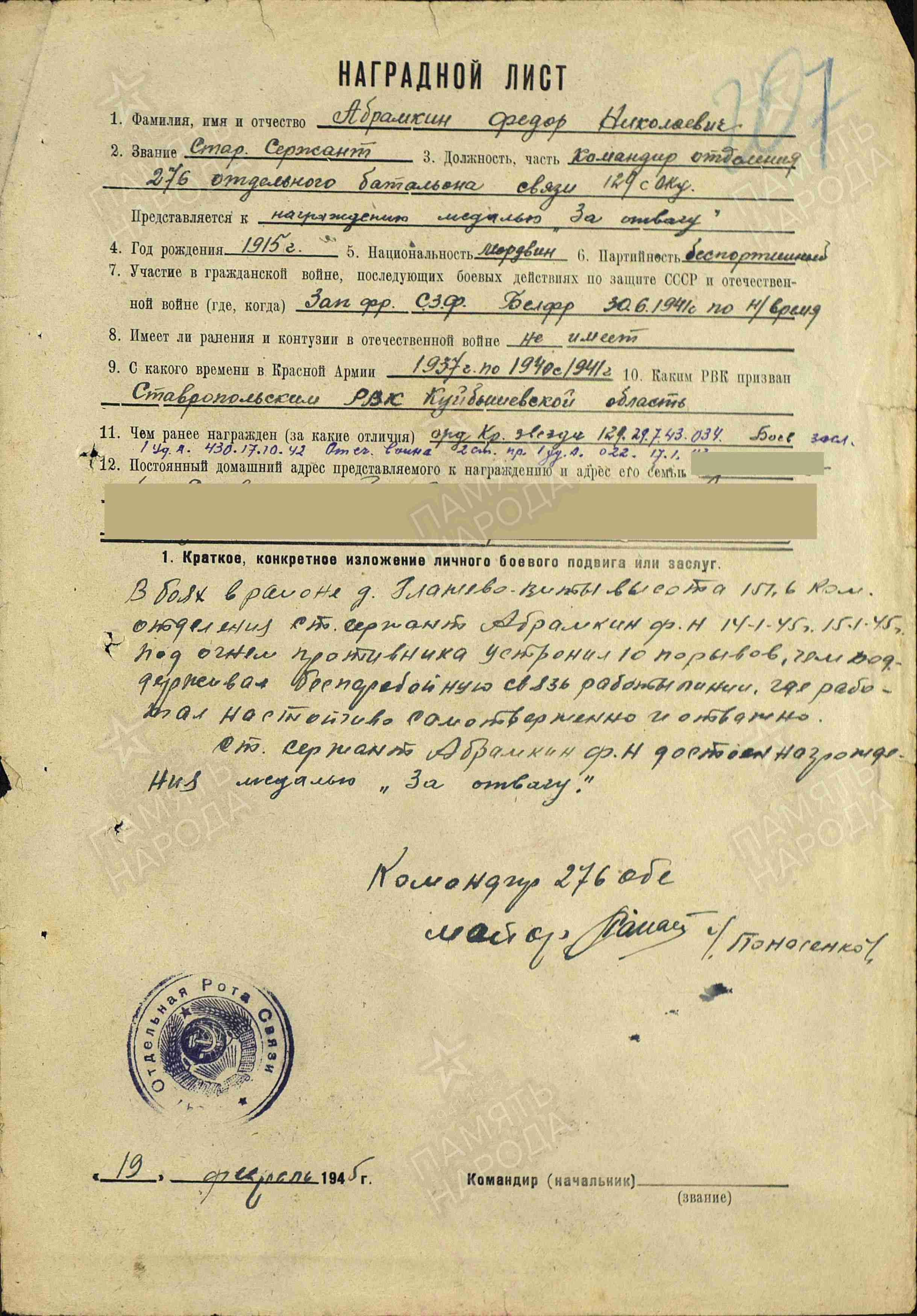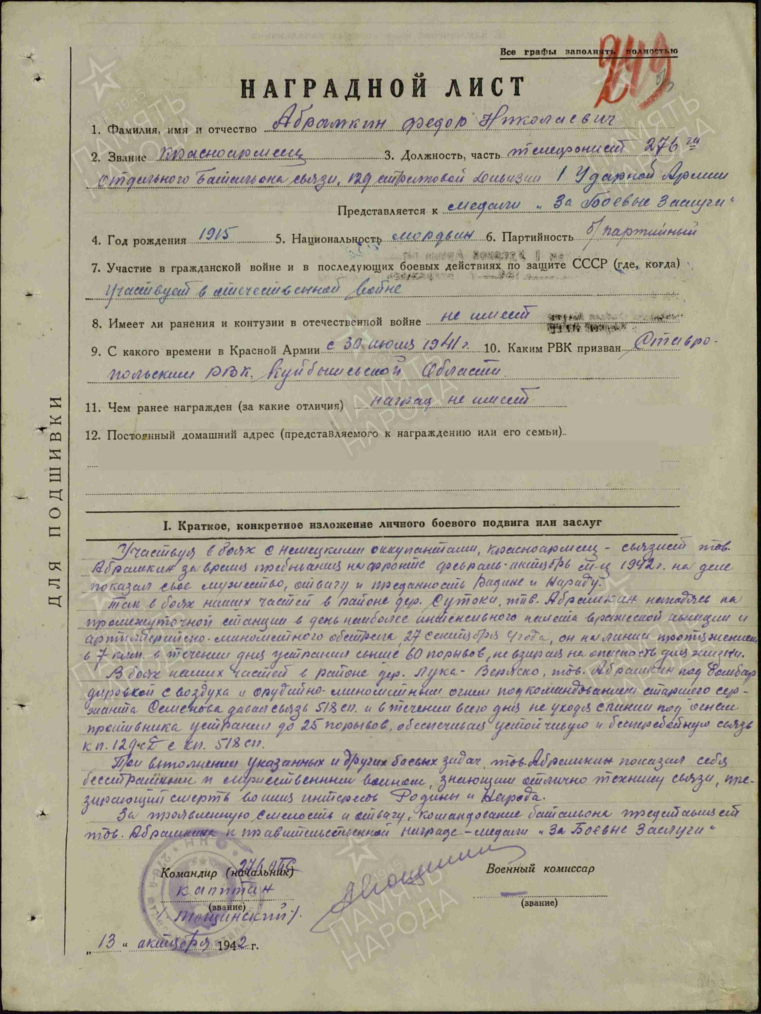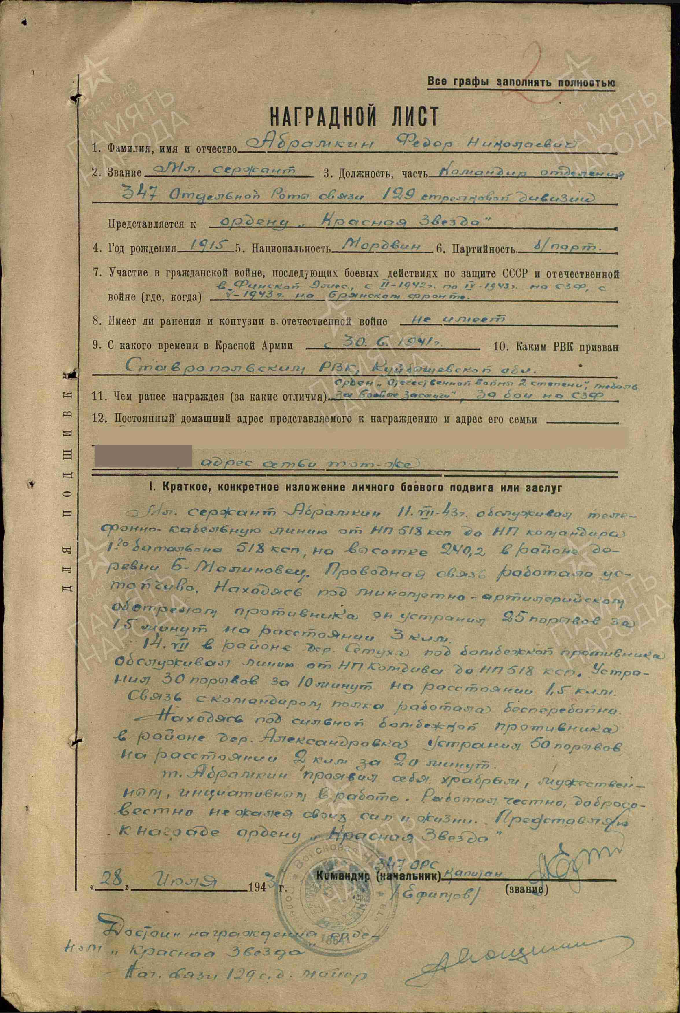 Абрамкин Федор Николаевич Федор Николаевич, мой прапрадед , 1915 г.р., уроженец села Верхнее Санчелеево Ставропольского района. Старший сержант, связист воевал составе 1 Ударной Армии Северо-Западного фронта Награждён орденом Отечественной войны II степени, орденом Красной Звезды, тринадцатью медалями. Из представления к награждению медалью "За боевые заслуги" : "Участвуя в боях с немецкими оккупантами,красноармеец- связист тов. Абрамкин за время пребывания на фронте февраль- октябрь 1942 года на деле показал свое мужество, отвагу и преданность Родине и Народу. Так в боях наших частей в районе дер. Сутоки, находясь на промежуточной станции в день наиболее интенсивного налета вражеской авиации и артеллеристско- минометного обстрела 27 сентября он на линии протяженностью 7 км в течение дня устранил свыше 60 прорывов, невзирая на опасность для жизни. В боях наших частей в районе дер. Лука- Веняско тов. Абрамкин под бомбардировкой с воздуха и орудийно- минометного огня, под командованием старшего сержанта Семенова, давал связь 518 с.п. и в течение всего дня, не уходя с линии, под огнем противника,обеспечивал устойчивую бесперебойную связь к.п. 12 сд и 518 с.п." https://1418museum.ru/heroes/47645553/ https://pamyat-naroda.ru/heroes/person-hero94976847/?backurl=%2Fheroes%2F%3Fadv_search%3Dy%26static_hash%3D8768748fcbd3bfe2054a94a81cada533v2%26last_name%3D%D0%90%D0%B1%D1%80%D0%B0%D0%BC%D0%BA%D0%B8%D0%BD%26first_name%3D%D0%A4%D0%B5%D0%B4%D0%BE%D1%80%26middle_name%3D%D0%9D%D0%B8%D0%BA%D0%BE%D0%BB%D0%B0%D0%B5%D0%B2%D0%B8%D1%87%26data_vibitiya_period%3Don%26group%3Dall%26types%3Dpamyat_commander%3Anagrady_nagrad_doc%3Anagrady_uchet_kartoteka%3Anagrady_ubilein_kartoteka%3Apdv_kart_in%3Apdv_kart_in_inostranec%3Apamyat_voenkomat%3Apotery_vpp%3Apamyat_zsp_parts%3Akld_ran%3Akld_bolezn%3Akld_polit%3Akld_upk%3Akld_vmf%3Akld_partizan%3Apotery_doneseniya_o_poteryah%3Apotery_gospitali%3Apotery_utochenie_poter%3Apotery_spiski_zahoroneniy%3Apotery_voennoplen%3Apotery_iskluchenie_iz_spiskov%3Apotery_kartoteki%3Apotery_rvk_extra%3Apotery_isp_extra%3Asame_doroga%3Asame_rvk%3Asame_guk%3Apotery_knigi_pamyati%26page%3D1%26grouppersons%3D1&search_view_id=smperson_rvk1078100248 Похоронен Абрамкин Федор Николаевич на кладбище села Верхнее Санчелеево. Его фотография находится в фондах школьного музея Боевой и трудовой Славы. Его имя занесено в Книгу Памяти Самарской области № 38. Я хочу, чтобы все люди на земле жили мирно. Они отдавали жизнь свою за то, что бы у нас было мирное небо над головой. Если каждый из нас будет добрый, миролюбивый и человечный, мы сохраним мир в нашей стране. Я не хочу войны. Я верю, что нас, детей двадцать первого века ждёт светлое будущее. Спасибо, дорогие ветераны, за победу, спасибо всем кто за нас сражался. А я в свою очередь твёрдо обещаю: Не лгать, не трусить, Верным быть народу. Любить родную землю-мать. Чтоб за неё в огонь и в воду. А если надо, то и жизнь отдать!