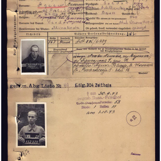 красноармеец. Попал в плен 12.10.1941 под Вязьмой. Узник лагеря Цайтхайн, Шталаг IV B, лаг.№15425.