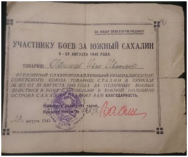 Имел благодарность лично от Сталина И.В за сражение на Сахалине.