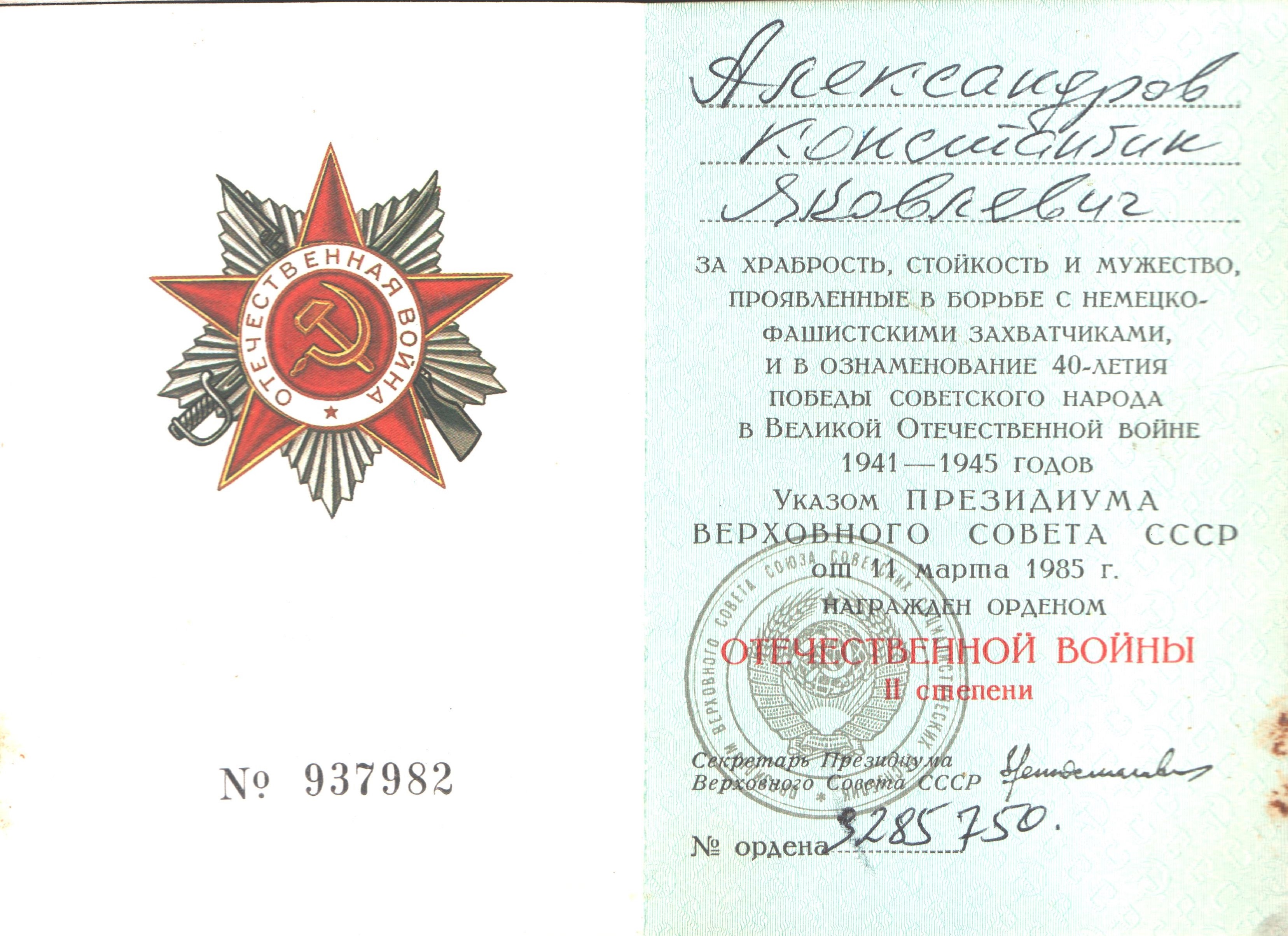 Германией», «За победу над Японией» (приказ от 09 июня 1945г.), орденом Отечественной войны 2-ой степени (архивный док. №89 от 06.04.1985г., орден №3285750 - украден, как и одна из медалей "За Отвагу").