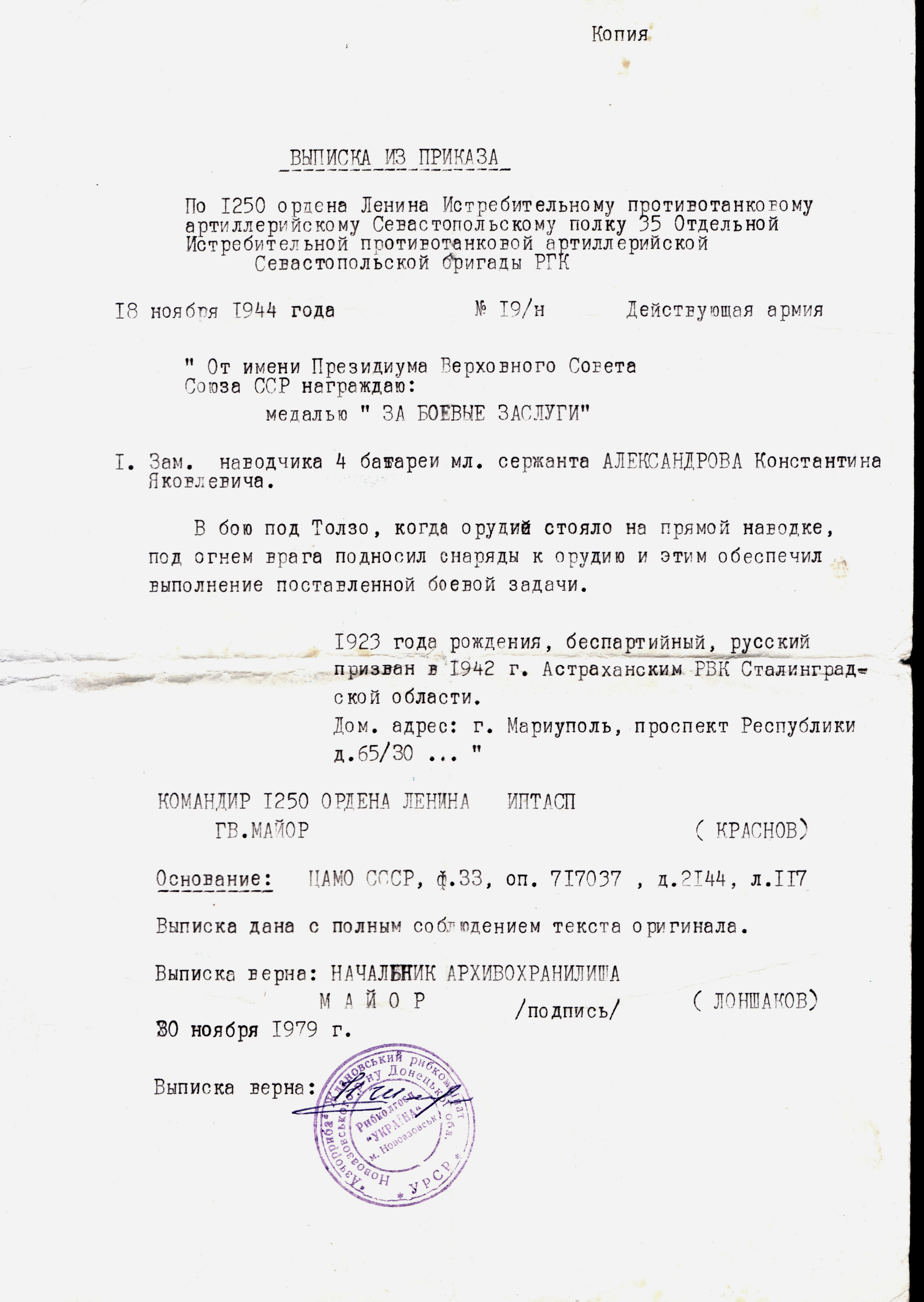 Месяцем позже приказом №: 20/н от 25 декабря 1944 его награждают медалью «За отвагу» за то, что "в бою за город Валмиера в Латвии он заменил