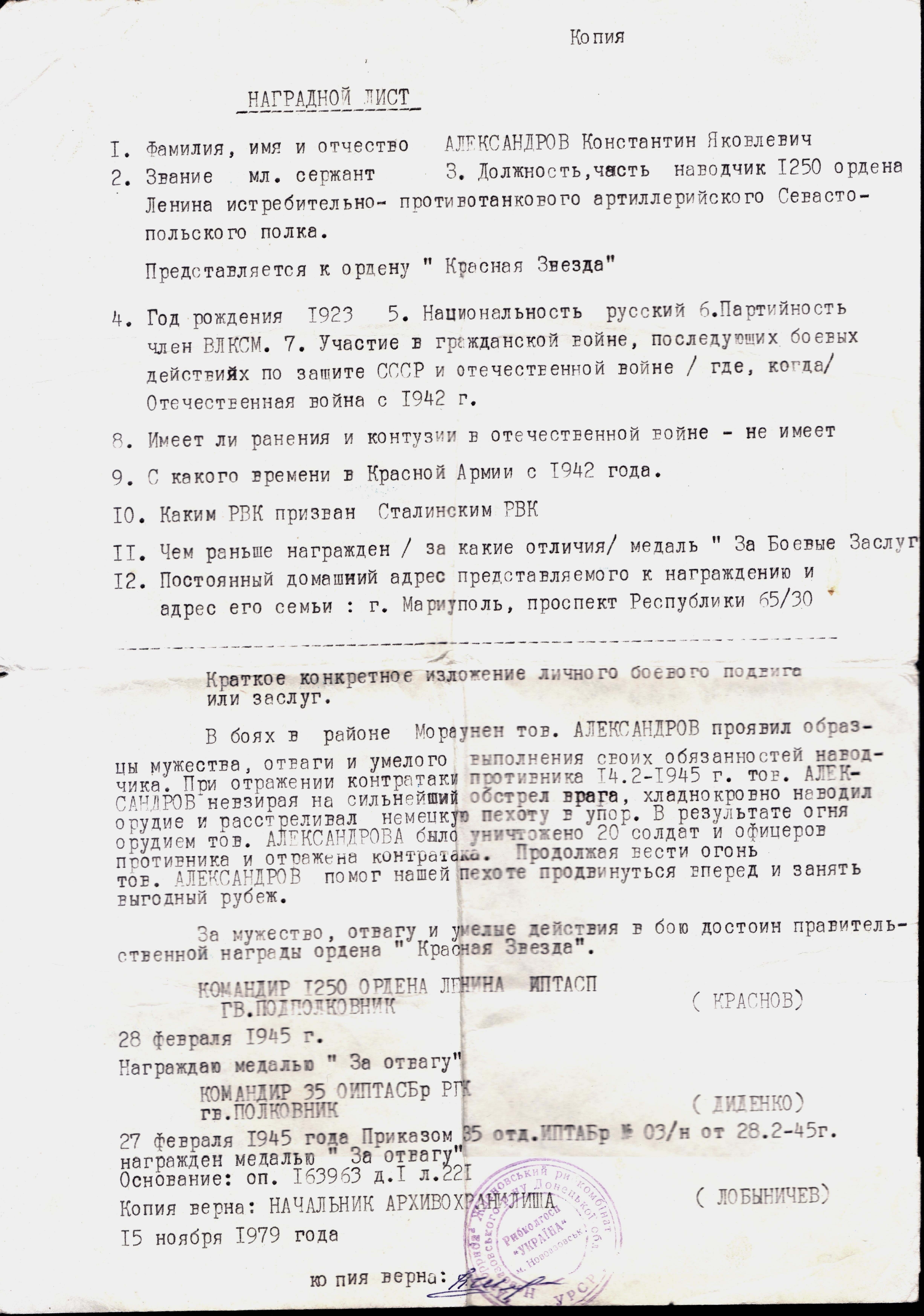 фактически награжден был второй медалью «За отвагу» (Приказ №: 3/н от 28 февраля 1945).