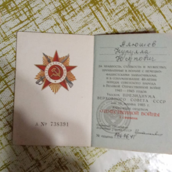 Алюшев Нурулла Юсупович рос в хорошей и уважаемой семье священнослужителей. Его отец Юсуп Ибрагимович участвовал в финской войне. Дед его был имамом местной мечети. Трудиться начал с раннего возраста. По возрасту был призван в армию. Сразу после армии был направлен на Калининский фронт, воевал под Калинином. Получил ранение и контузию. Лежал в госпиталях. Про войну особо не любил рассказывать. Был скромным. После войны был направлен на заготовку архангельского леса. После работал в колхозе. Был награжден разными орденами. Занимался скорняжным делом, выделывал шкуры. Узнали об этом и пригласили работать в Лопатинский район Пензенской области заготовителем. Работал больше 20-ти лет. Пригласил бывший фронтовик Кулаков Александр Иванович, его друг, который был родом из Петровска Саратовской области. Где работал до пенсии. Был много раз награжден наградами и орденами.