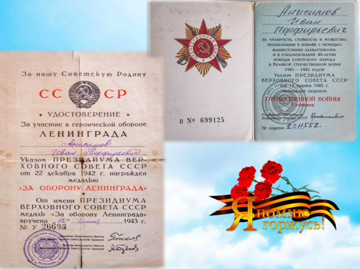Мой дед, Анисимов Иван Порфирьевич призван на фронт Зеленодольским РВК в начале 1942 года на Ленинградский фронт. В конце 1942 года получил тяжелое ранение в горло и попал в плен в пригороде г. Пушкин Ленинградской области. Фашисты бросили его в сарай вместе с другими бойцами. Ночью он с тремя товарищами совершил побег, и зажимая рану на горле травой три дня пробирался к своим через линию фронта. Награжден Орденом Отечественной войны 1 степени и медалями. Демобилизован из Ленинградской области, Пушкинский район, д. Кирпузи.