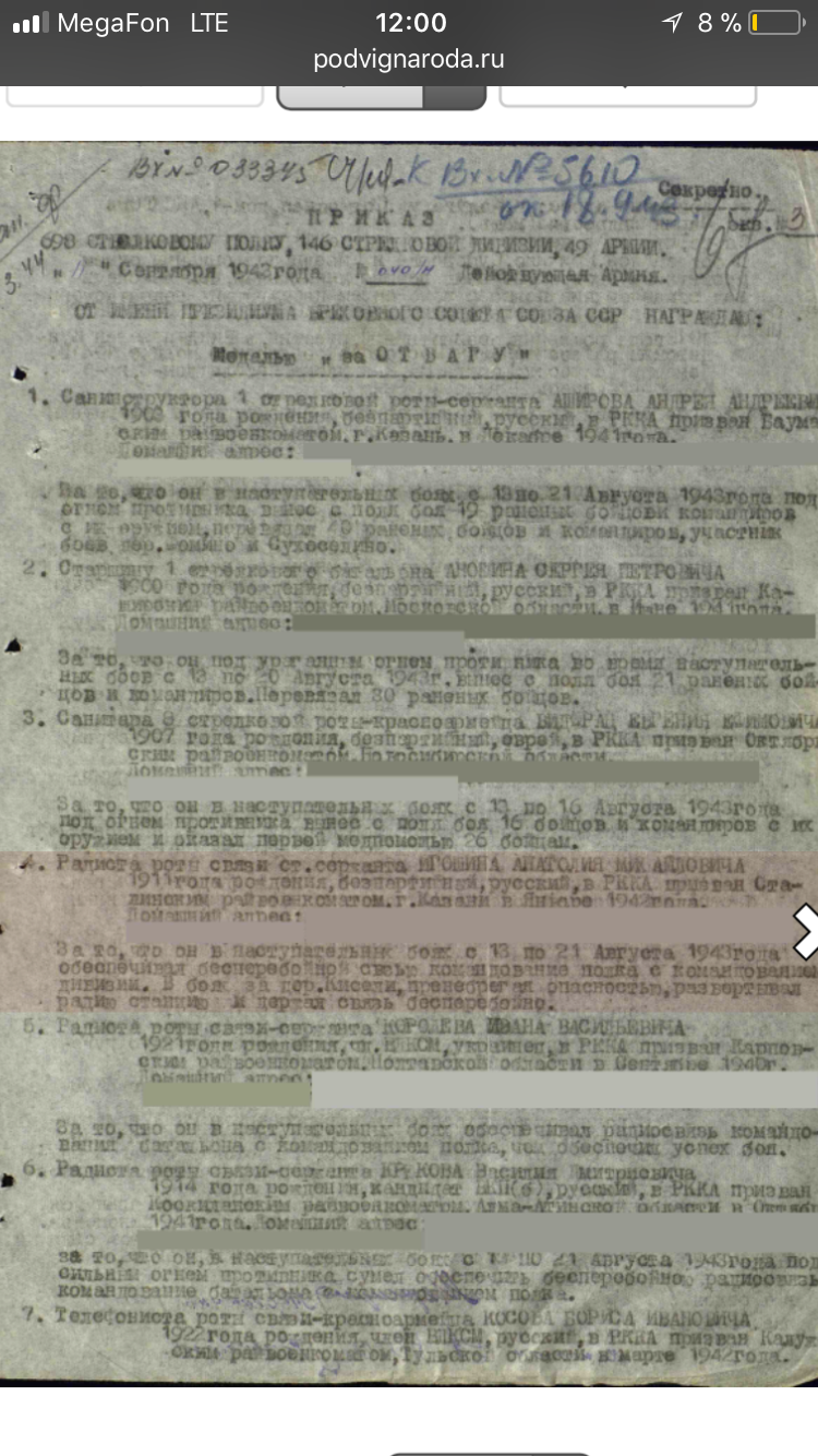 Во время наступательной атаки с 12-20 августа , вывел с поля боя 30 раненых солдат и командиров .