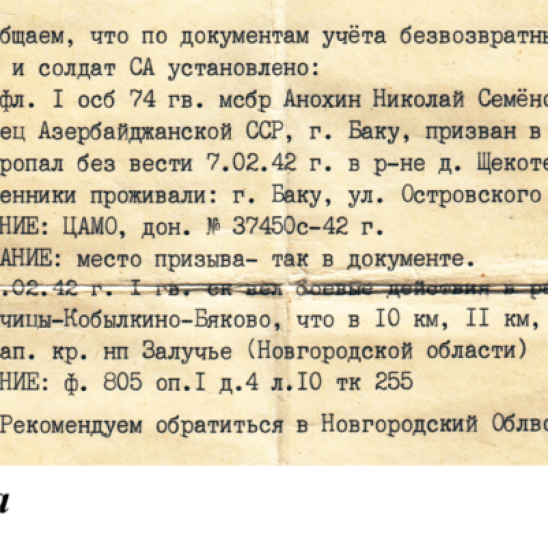 со страшными словами «…Ваш сын красноармеец Николай Анохин пропал без вести…»,