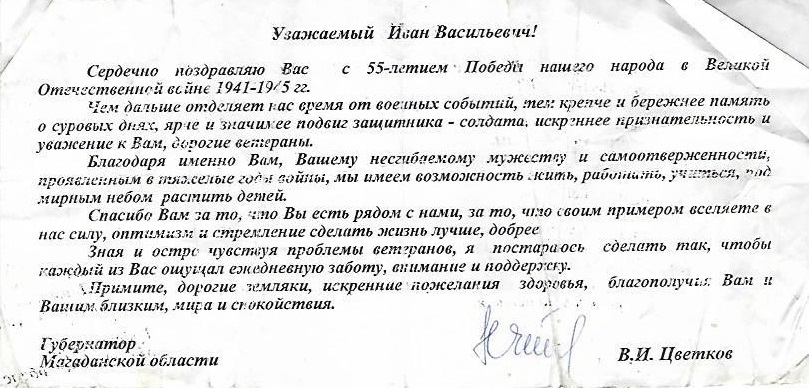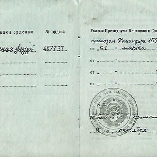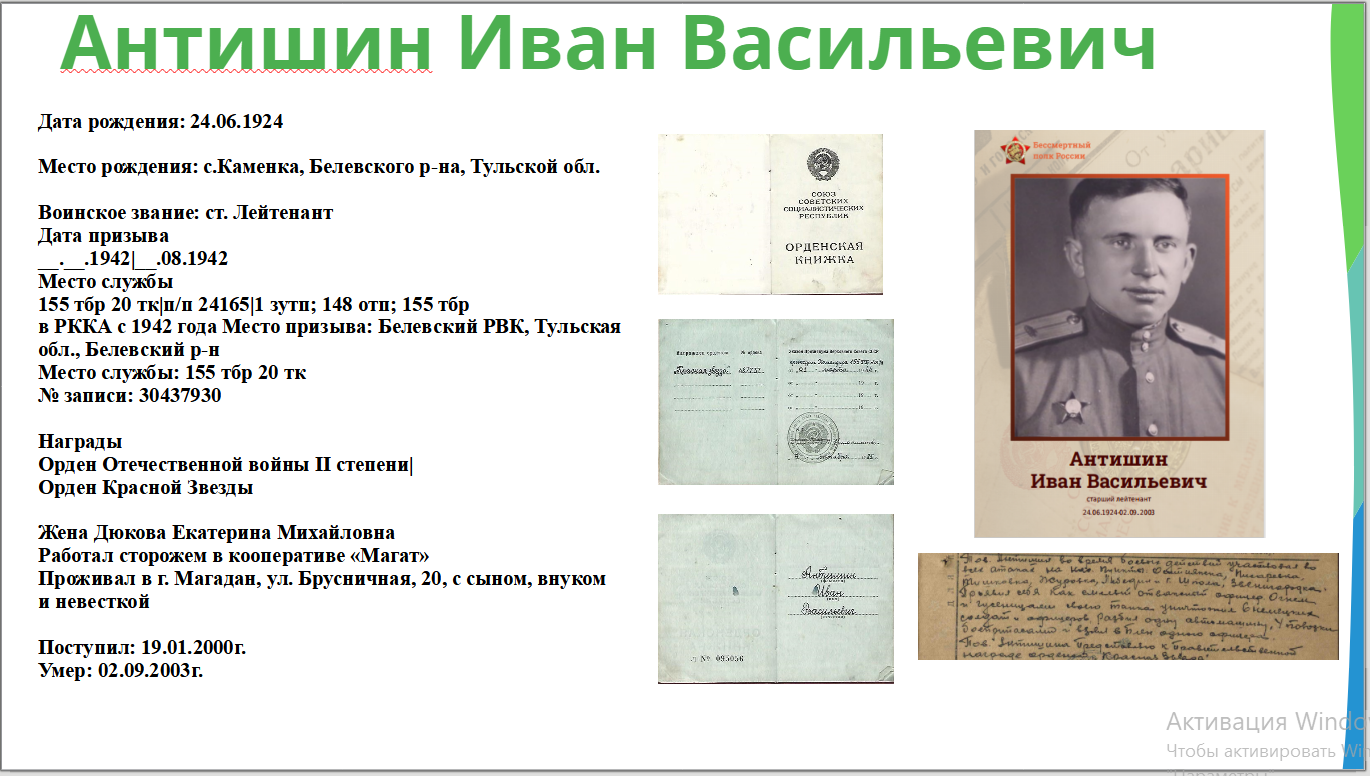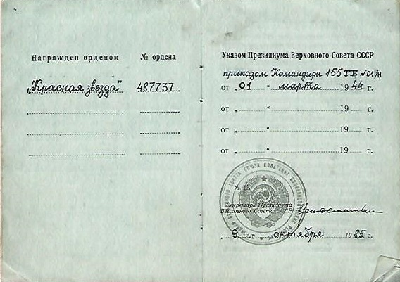 Воинское звание: ст. Лейтенант Дата призыва __.__.1942|__.08.1942 Место службы 155 тбр 20 тк|п/п 24165|1 зутп; 148 отп; 155 тбр Звание: лейтенант в РККА с 1942 года Место призыва: Белевский РВК, Тульская обл., Белевский р-н Место службы: 155 тбр 20 тк № записи: 30437930,155 танковая бригада, 148 отдельный танковый полк Жена Дюкова Екатерина Михайловна Работал сторожем в кооперативе «Магат» Проживал в г. Магадан, ул. Брусничная, 20, с сыном, внуком и невесткой Поступил в Магаданский Дом-интернат: 19.01.2000г. Умер: 02.09.2003г.