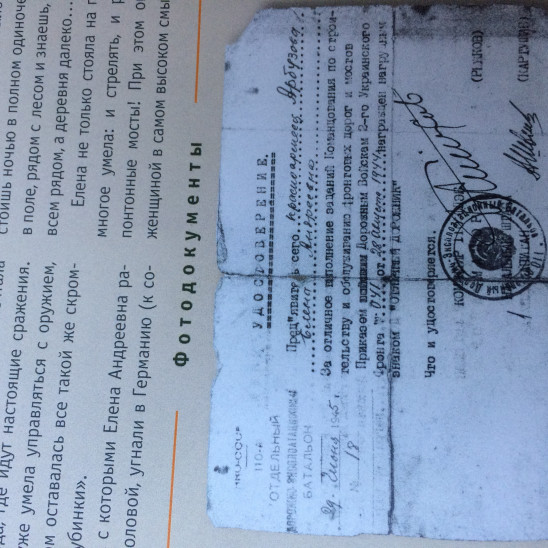 Я только спустя годы поняла , насколько моя работа была опасна." Елена Андреевна находилась на "рабочем месте",когда в Москву везли румынского диктатора Антонеску ,союзника Гитлера. Однажды на посту она чуть не погибла,сбитая огромной машиной: хрупкую девушку-регулировщицу просто не увидели в дорожной пыли. Но и страшно было тогда ,когда стоишь ночью в полномодиночестве на посту поле,рядом с лесом и знаешь,что немцы совсем рядом,а деревня далеко....Елена не только стояла на посту,она уже многое умела:стрелять,и ремонтировать контонные мосты!