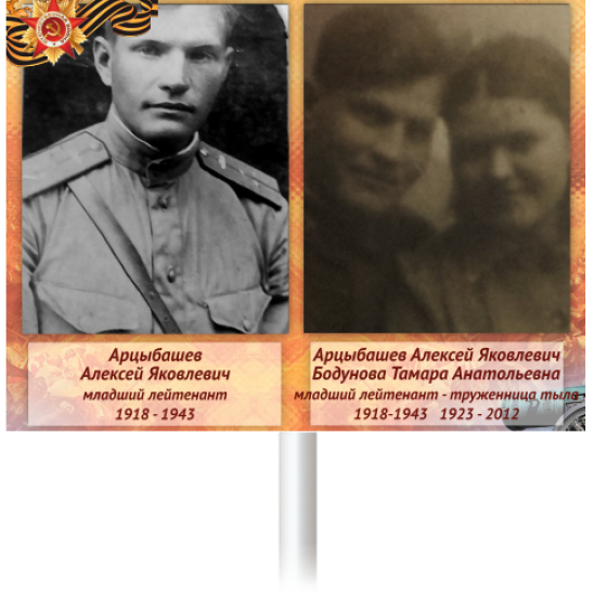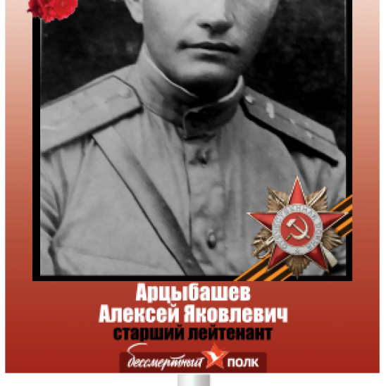 Мой дед Арцыбашев Алексей Яковлевич, старший лейтенант, танкист. Был призван на войну Московским ГВК. П/П 56267. Воевал до 27.06.1944 года. Был подбит и сгорел в танке под деревней Крушиновка Могилёвской области. Признан пропавшим без вести. Моя бабушка Бодунова Тамара Анатольевна получила похоронку.