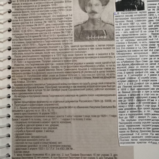 Леон Семенович Арьков (1889-1947) родился в хуторе Рубежный станицы Голубинской, из раскольников, образование самоучка. В службу вступил рядовым 1 января 1911 г. в 4-й Донской казачий графа Платова полк, прослужил в нем семь лет. В 1916-м за боевые отличия был произведен в приказные, в младшие, а затем и старшие урядники. В бое вой части находился до 22 февраля 1918 г. Участвуя в походах и делах против неприятеля на Германском фронте, получил контузии головы (1914 г.) и ранения в правую (1916 г.) и левую ноги (1917 г.) Из архивных материалов следует, что приказный 1-й сотни 4-го Донского казачьего полка награжден Георгиевским крестом 4-й степени (№ 199579), Георгиевским крестом 3-й степени (№ 29777, день совершения подвига 30.03.1915 г.), Георгиевским крестом 3-й степени (№ 106966, 12.08.1915 г.). Младший урядник 1-й сотни Арьков награжден Георгиевским крестом 2-й степени (№ 21580.) Приказом по 5-й армии №№ 139 от 1915 г. приказный 1-й сотни Леон Арьков, награждённый Георгиевским крестом 4-й степени, представляется к Георгиевскому кресту 3-й степени: «30.01.1915 г., будучи начальником головного дозора от офицерского разъезда, подошел к д. Суль, занятой противником, и, желая определить численность, вызвавшись охотником, проскакал вдоль деревни и тем самым вызвал на себя огонь полуроты немцев, после чего присоединился к разъезду». После революционного переворота в 1917 году казак присяги не менял и оказался в Бепой армии в 43 конном полку. В этот период из старших урядников произведен в вахмистры, а 7.01.1920 г. в подхорунжие. Получил ранение в правую руку. Известно, что Георгиевским крестом знаком отличия рядовых и нижних чинов одной и той же степени дважды не награждали. Однако, то ли фронтовая неразбериха в штабах, то ли по другим причинам, но о нашем земляке Леоне Семеновиче Арькове в послужном списке командного состава 2-го Донского округа военного комиссариата об уволенных в запас сказано, что «казак ст. Голубинской имеет знаки за боевые отличия: 5 Георгиевских крестов, из которых - 1 четвертой степени, 3 креста третьей степени и 1 второй степени. Женат на дочери казака Агафье, 33-х лет». Кружево военного лихолетья Гражданской войны наложило на судьбу донца свой отпечаток. Он оказался в Красной Армии. Прослужил три месяца и как инвалид второй категории был де мобилизован. Жил в хуторе 10 лет Октября (ныне Суровикинский район), работал колхозни ком в одноименном колхозе. Но награды и послужной список Георгиевского кавалера не давали покоя «неравнодушным» соседям. Далее процитируем фрагменты из отдельных документов Российского ГВИА (Ф. 50058, оп. 1. Пунктуация и орфография сохраняются). Л.С. Арьков «упоминается в уголовном деле № 9464 по обвинению Никулина Емельяна Васильевича и других) по ст. 58 п. 10, 11; анкета арестованного 14 апреля 1933 г.: - имущественное положение в момент ареста: 1 хата 1 корова 1 овца; тоже до 1929 г.: 1 пара Быхов 1 корова 5 га посеву, тоже до 1917 г.: 1 корова 2 га посеву 2 казы; - социально положение в момент ареста: колхозник - служба в царской армии и чин, урядник, - служба в белой армии и чин: рядовой: - служба в Красной армии: 3 месяца; - русский (казак); - образование: неграм (отный); категория воинского учета: нет; - состоял ли под судом и следствием: нет; - состояние здоровья: со слов 2 категории инвалид - арестован 3 апреля 1933 г. О.Г.П.У. 3-й ИЗО 28К №№.... Состав семьи: 1. жена Агафия Аликсеева 45 л. дом хоз. 2. сын Трафим Леонтивич