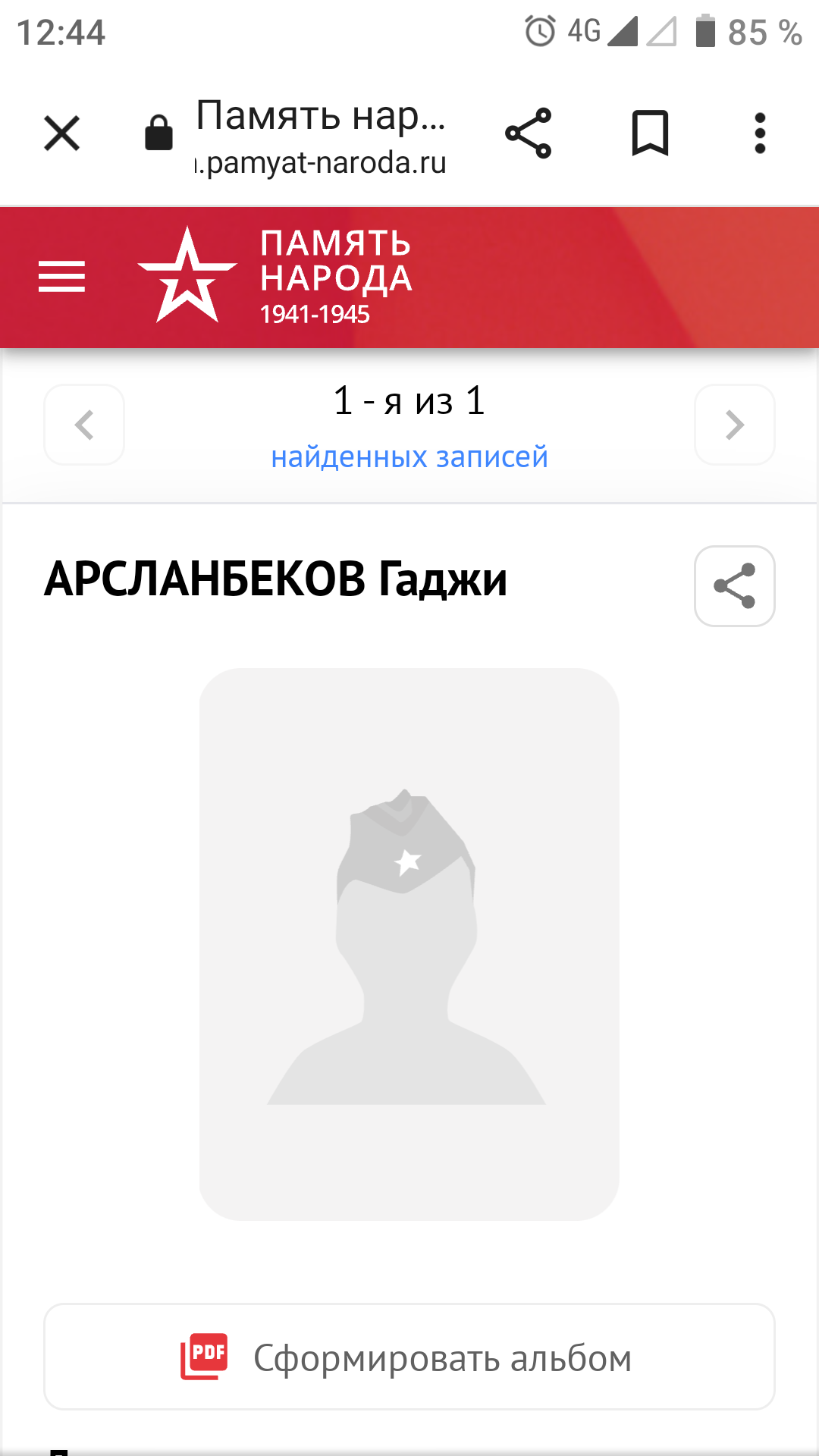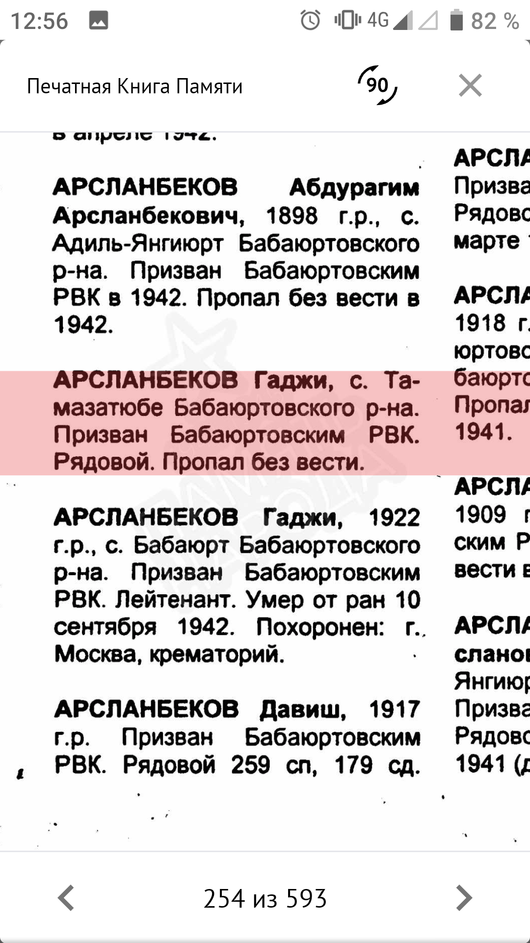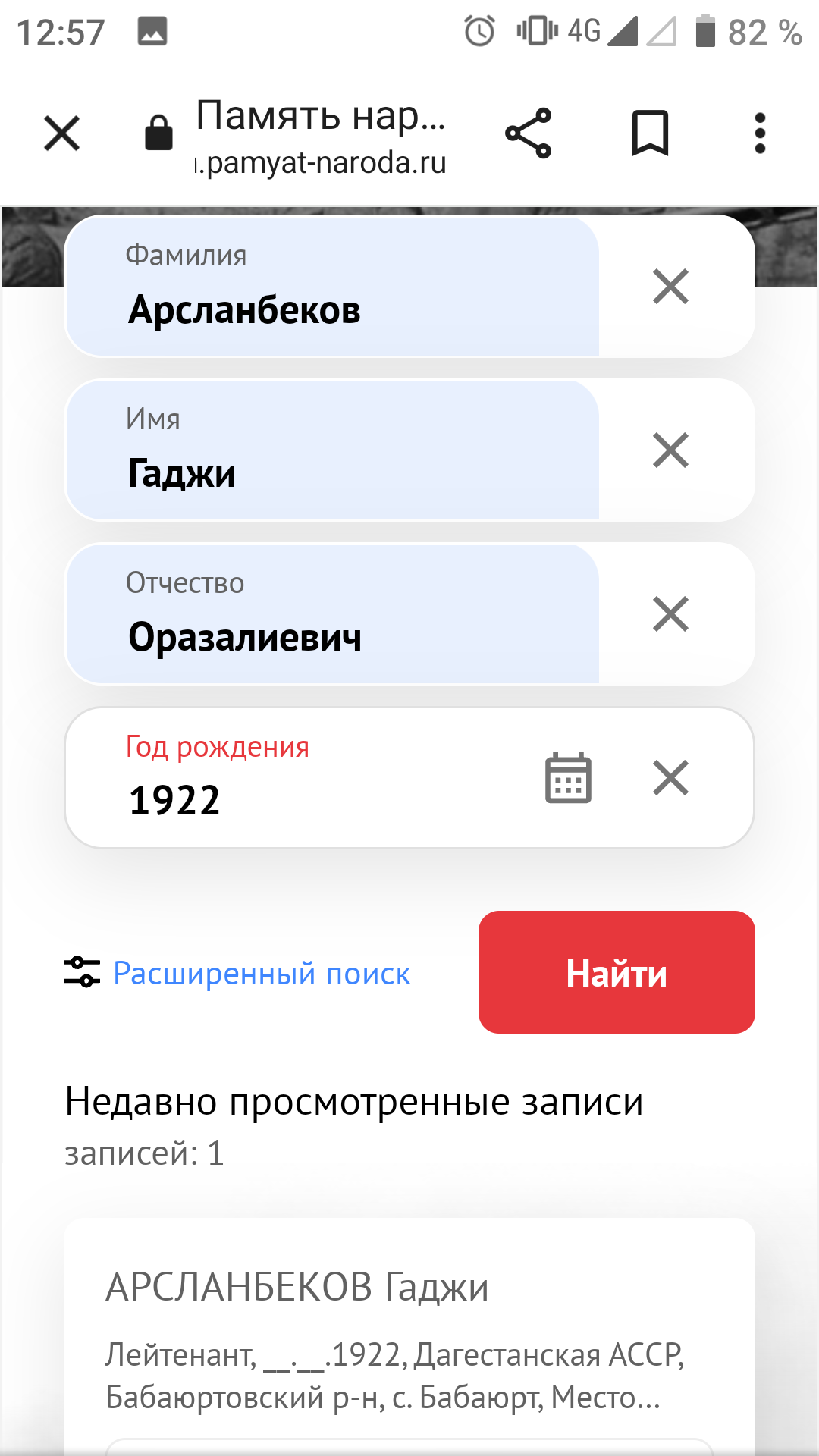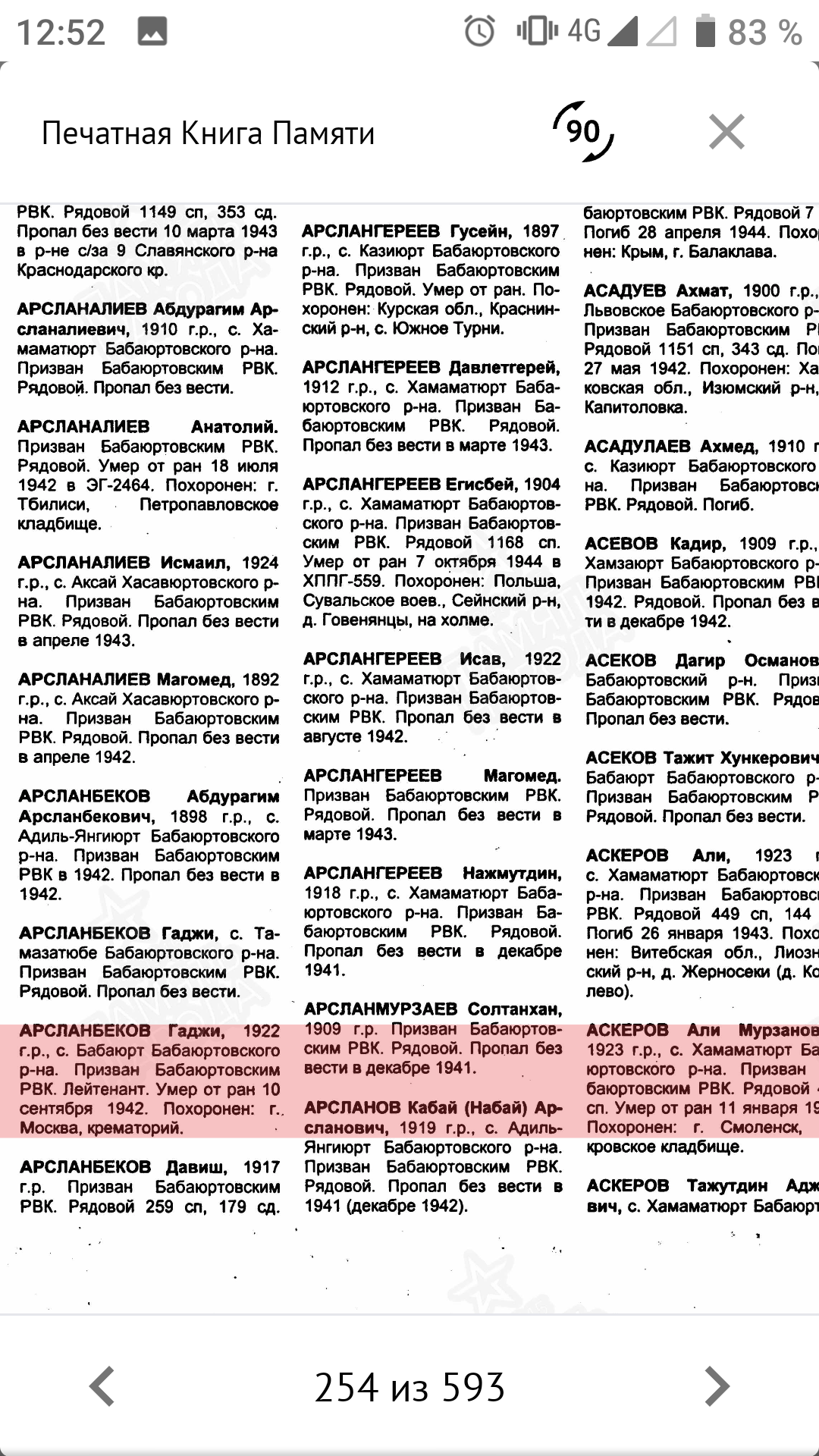 Великая Отечественная война - одно из самых ярких и трагических страниц в истории нашей страны. Массовый героизм советских солдат и обычных граждан приводил врага в замешательство. Немцам были непонятны его причины, истоки. Мы гордимся подвигом нашего народа, передаём историю нашим детям. Эта война оставила незаживающие душевные раны у каждой семьи, так как нет семьи, которой не коснулась эта война. Не прошла война стороной и мимо моих предков. 26 марта 1945 года, освобождая Польшу, погиб смертью храбрых мой прадед, кавалер ордена Ленина Байтемиров Абдулла Джантемирович, пропал без вести его брат Абдулмуталим в первые дни войны в Брестской крепости. Он был среди тех, кто ранним утром 1941 года первыми приняли жестокий удар немецкой армии. Сегодня хочу рассказать о брате моего деда по отцовской линии. Арсланбеков Гаджи Оразалиевич, 1922 года рождения. 18-летним был призван в ряды Красной Армии Бабаюртовским РВК. Он был старшим из детей в семье. Учился в школе села Бабаюрт. За отличную учёбу в виде поощрения в 1937 году был направлен в международный лагерь "Артек", где отдыхал с детьми испанских коммунистов. После школы он закончил финансовый техникум в Харькове. С началом войны был призван в армию и направлен на учёбу в Буйнакское пехотное училище, по окончанию которого попал на фронт в период наступления наших войск, оттесняя врага от Москвы. Воевал он в составе 1295 СП 160 СД 33 Армии Западного фронта во главе с генералом М. Ефремовым. Перед 160 стрелковой дивизией ставилась задача прорвать оборону противника в районе Хотилово и выйти на рубеж восточного берега реки Воря и прочно закрепиться. Ударную группу в операции составили 1293, 1295 и 1297 стрелковые полки. 13 августа они успешно прорвали первый рубеж обороны и заняли деревни Хотилово и Замятино. На второй день продолжили наступление и вышли ко второму рубежу обороны. В последующие дни велись ожесточённые, кровопролитные бои за опорные пункты Павловское, Луково, Игнатьево. Противник упорно оборонялся. В оперативных донесениях по часам описаны боевые действия в этом районе. Бомбили их 10 бомбардировщиков Ю-88. Противник вёл непрерывный пулемётный, миномётный огонь. Очень тяжело давалось наступление. Было много потерь ранеными и убитыми. 15 августа 1942 года тяжело ранило и Гаджи. С диагнозом "Сквозное пулевое ранение правой половины грудной клетки. Открытый пневмоторакс" он был доставлен в эвакогоспиталь в Москве, где 10 сентября 1942 года умер от этого тяжёлого ранения. Было ему 20 лет. Всего лишь 20 лет! Не успел обзавестись семьёй, оставить после себя потомство. В каком духе патриотизма было воспитано его поколение, видно из его последнего письма отцу, написанного 1 августа 1942 года: "Я сейчас командир взвода. При выпуске с училища мне было присвоено звание младший лейтенант. А 26 мая сего года мне присвоили звание лейтенант. Отец, я уже все материалы подготовил перевода меня из кандидата партии в член партии. Так что я в бой вступаю членом партии и защищу свою Родину против немецких оккупантов. Мы отомстим за все муки нашего народа, за все страдания и мучения, которым подвергают немецкие оккупанты наших близких и родных, друзей. Я сын советского народа и вышел из Дагестана, буду драться и бороться не щадя своих сил и самой жизни, чтобы 1942 год стал годом окончательного разгрома немецких оккупантов". Вот такой 