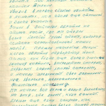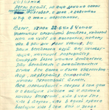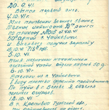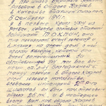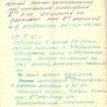 Мой дедушка Артамонов Николай Николаевич родился 07 января 1920 г., в с. Владимировка, Николаевской области УССР. 01 сентября 1940 г. был призван в ряды Советской армии Владимирским РВК. До ВОВ проходил военную службу в 22 легко-танковой бригаде, 4 Армии Белорусского Особого военного округа. Часть эта находилась в г. Брест-Литовск, в 8 км, западнее от города, близ германской границы. Война застала дедушку в первый день, 22 июня 1941г. При неожиданном массированном натиске немецких войск, их бригада не приняла боя – отступила. При отступлении, часть личного состава бригады прибыла в г. Ново-Зыбков, Белорусской ССР. В Ново-Зыбкове формировались новые войсковые части. При подходе немецких войск эти, еще полностью не сформированные части отступали по направлению в г. Могилев. В Могилеве, в начале июля 1941 г. дедушка попал в штаб 25 Мех. корпуса- строевой отдел на должность ст. писаря. Уже в августе 1941г. Этот мех. корпус был расформирован и на базе штаба корпуса и других штабов соединения был сформирован штаб Брянского фронта, где дедушка и проходил службу в отделе кадров фронта. В сентябре 1941г. Был переведен в отдел кадров 50 Армии. За отличное выполнение своих обязанностей мой дедушка был награжден серебряным портсигаром, вот что написано в его характеристике: «…умеет хранить военную тайну. В сложной обстановке в 1941 году под Тулой оказавшись оторванным от Штаба полностью сохранил канцелярию Отдела и доставил ее в штаб…» А в 1944 г. за своевременное выполнение своих функциональных обязанностей мой дедушка был награжден Орденом «Красной звезды». Описание подвига: "Старший лейтенант а/с АРТАМОНОВ в Отделе кадров 50 армии работает с момента организации армии. За 3 года работы в отделе вырос от писаря до помощника начальника 2 отделения.На всем протяжении своей работы проделывает исключительную работу с своевременным выполнением заданий Командования. Быстро и не допуская ошибок отрабатывает наградной материал для доклада Военному Совету армии. В самых трудных условиях ежедневного движения в пути за наступающими частями тов. Артамонов сумел обеспечить вывоз медалей приказов о награждении и немедленно доводит их до сведения командиров частей.Неоднократно Артамонову давались сложные поручения по доставке орденов и медалей частям и соединениям, с этой задачей тов. Артамонов всегда справляется хорошо.08.07.1944 юго-восточнее Минска в районе д. Добренева противник пытаясь выйти из окружения группой около 300 чел. напали на штаб армии, завязался короткий бой по уничтожению этой группы. Тов.Артамонов спокойно и мужественно выполнял все поручения начальника, ему было поручено вывезти автомашину с документами в безопасное место. Презирая опасность для жизни под ружейно-автоматным огнем противника тов. Артамонов погрузил ордена и имущество на машину и вывел машину в безопасное место".