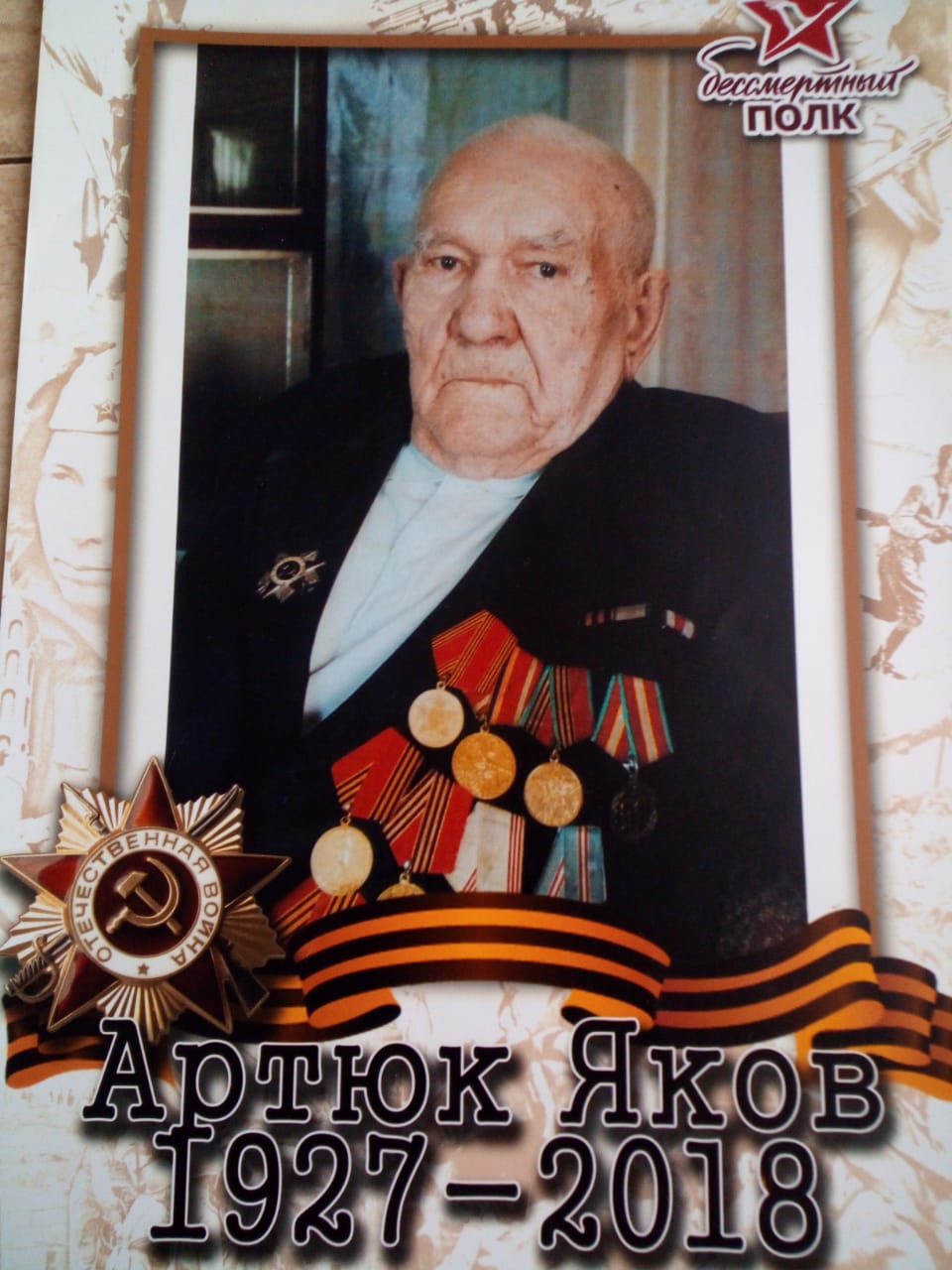 Боевой путь ветерана Артюк Яков Антонович, призван на военную службу в ноябре 1944 года, гражданская профессия - кузнец, участвовал в войне с Японией. Был пулеметчиком. Награжден медалью "За отвагу" за то, что "в бою с японскими агрессорами в районе населенного пункта Дэх в Маньчжурии 14.08.1945 г. в составе группы бойцов из 15 человек ворвался в расположение противника, уничтожил 1 офицера и захватил 5 пушек и 13 лошадей. В бою действовал смело и решительно, воодушевляя бойцов на выполнение поставленной задачи". Также награжден медалями "За победу над Японией" и "30 лет Советской Армии и Флота". Награжден орденами Отечественной войны I и II степеней.