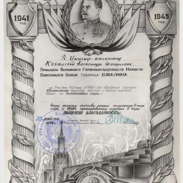 Путь, который прошла Александра Григорьевна в Великой Отечественной войне, можно проследить по благодарностям, объявленным Гвардии Инженер- капитану Ковалевой А.Г., командиром Воинской Части Гвардии Генерал-лейтенантом Авиации Счетчиковым, по приказу Верховного Главнокомандующего Маршала Советского Союза товарища Сталина за участие в операциях :