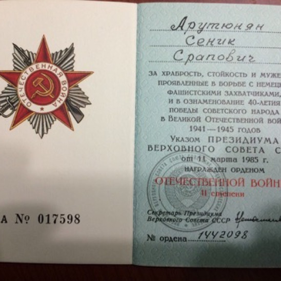 хранятся боевые награды, медали, фото и документы того времени. Арутюнян Сеник