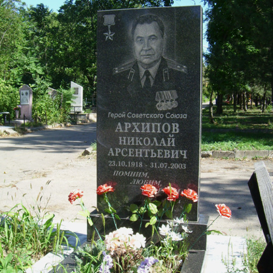 Архипов Николай Арсентьевич - командир эскадрильи 32-го истребительного авиационного полка 256-й авиационной дивизии 2-й воздушной армии Воронежского фронта, на момент присвоения звания Героя Советского Союза - капитан. Родился 23 октября 1918 года в деревне Путенково ныне Брейтовского района Ярославской области в крестьянской семье. Русский. В 1929 году с родителями переехал в Рыбинск Ярославской области. По окончании 7 классов и школы ФЗУ работал на Волжском машиностроительном заводе. Окончил аэроклуб. В Красной Армии с 1939 года. В 1940 году окончил Сталинградскую военную авиационную школу лётчиков. Участник Великой Отечественной войны с июля 1941 года. Член ВКП(б)/КПСС с 1942 года. Командир эскадрильи 32-го истребительного авиационного полка (256-я авиационная дивизия, 2-я воздушная армия, Воронежский фронт) капитан Николай Архипов к середине июня 1943 года совершил двести семьдесят пять боевых вылетов, в ста тридцати четырёх воздушных боях сбил лично одиннадцать и в составе группы – восемь вражеских самолётов. 16 июля 1943 года под Курском коллективный подвиг совершили лётчики-истребители авиационной эскадрилья из четырех самолётов, которую возглавлял Николай Архипов. В этот день советские лётчики встретились с воздушной армадой противника из двадцати шести «хейнкелей» и «мессершмитов». Капитан Архипов первым атаковал врага, сбив двух фашистских стервятников. Личный пример командира вдохновил других лётчиков: всего гитлеровцы потеряли в этом бою семь истребителей. Указом Президиума Верховного Совета СССР от 28 сентября 1943 года за мужество и героизм, проявленные в борьбе с немецко-фашистскими захватчиками, капитану Архипову Николаю Арсентьевичу присвоено звание Героя Советского Союза с вручением ордена Ленина и медали «Золотая Звезда» (№ 1251). Отважный пилот с честью прошел до конца войны. День Победы встретил в Литве. Всего за период боевых действий произвел 382 боевых вылета из них: 31 боевой вылет на разведку; 41 на штурмовку аэродромов и войск противника, на сопровождение бомбардировщиков 26 боевых вылетов, 60 – на прикрытие штурмовиков и 224 вылета на прикрытие своих войск от ударов с воздуха. Провел 148 воздушных боев в которых сбил 26 самолетов противника. После войны Н.А. Архипов продолжал военную службу в ВВС СССР. В 1948 году он окончил Высшие лётно-тактические курсы, а в 1953 году – курсы усовершенствования офицерского состава при Военно-воздушной академии. С 1955 года служил в Войсках противовоздушной обороны (ПВО) страны. С 1973 года полковник Архипов Н.А. - в запасе, затем в отставке. Жил в Ростове-на-Дону, работал начальником штаба гражданской обороны. Многие годы возглавлял юнармейский Пост № 1 у мемориала Огня Вечной Славы. Умер 31 июля 2003 года. Похоронен на Северном кладбище в Ростове-на-Дону. Награждён орденом Ленина, 2 орденами Красного Знамени, 2 орденами Отечественной войны 1-й степени, 2 орденами Красной Звезды, 2 медалями "За боевые заслуги", медалями "За оборону Москвы", "Жукова", медалью КНР "Китайско-Советская дружба", юбилейными медалями. Имя Героя высечено на памятнике в Рыбинске на Аллее Славы. По материалам: Уфаркина Н.В., сайта "Герои страны", книг Герои огненных лет. Ярославль: Верхне-Волжское кн. изд., 1985, "Герои Советского Союза": крат. биогр. слов. Т.1. – Москва, 1987.