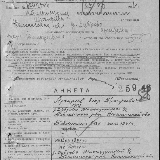 Архиреев Егор Тимофеевич родился в 1902 году в деревне Дуброво Калининской (ныне Тверской) области. К сожалению, его боевой путь неизвестен. Письменная связь с ним была прекращена в ноябре 1941 года. Дата выбытия из рядов Красной армии - июнь 1943 года, причина - пропал без вести. Потомки Егора Тимофеевича не забывают о нём. Каждый год, 9 мая, его портрет участвует в шествии бессмертного полка. Егор Тимофеевич навсегда в нашей памяти.