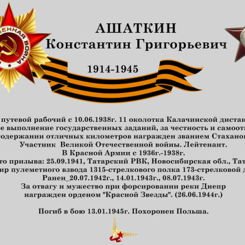 АШАТКИН КОНСТАНТИН ГРИГОРЬЕВИЧ - Старший путевой рабочий Калачинской дистанции пути с 1935г. В 1939г. награжден за хорошую работу отрезом на костюм-7м. За