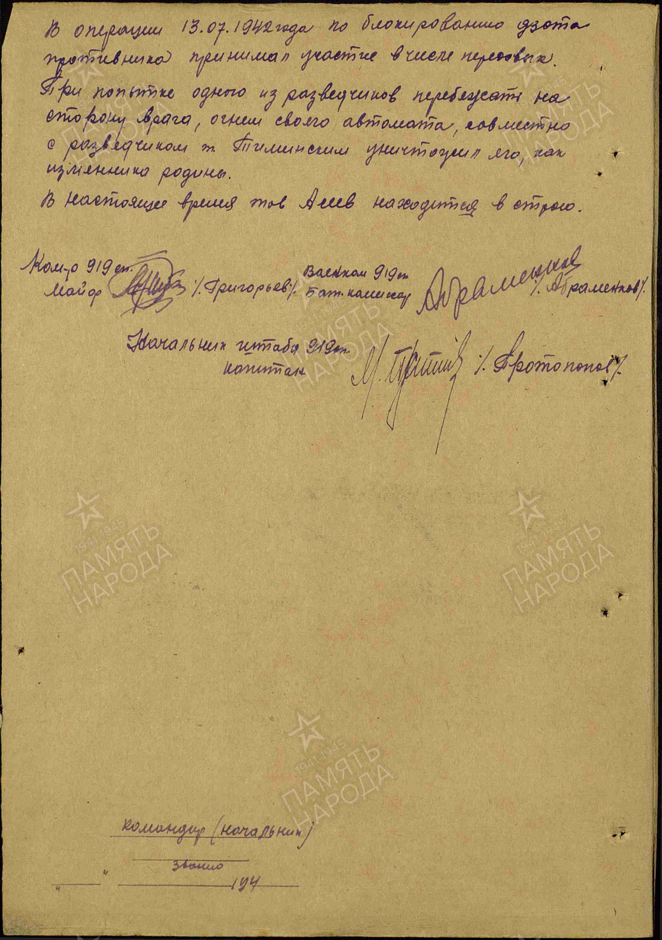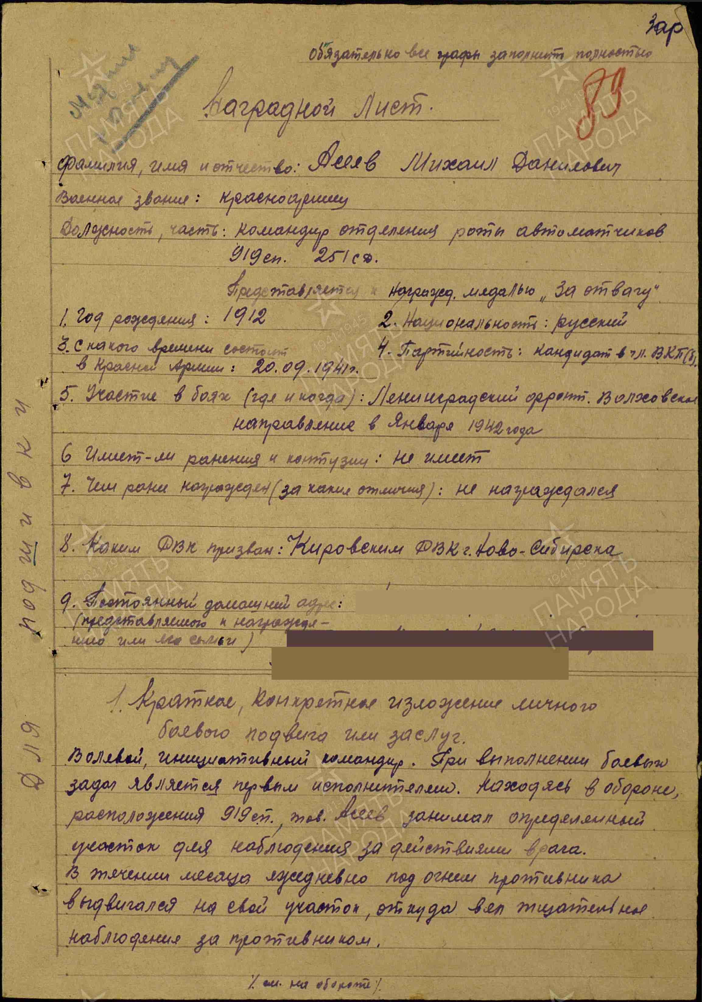 Мой прадедушка Асеев Михаил Данилович родился 18 ноября 1912 г. в деревне Уколовка, Алтайского края. После начала Великой Отечественной войны, Михаил Данилович был мобилизован в ряды Красной Армии 20.09.1941. Он защищал Москву и Ленинград. Под Москву прадедушка был переведен в составе «сибирских дивизий», сыгравших важную роль в обороне столицы и победе Красной Армии в битве за Москву. Он служил в армейской разведке, был награжден медалью «За отвагу» в 1942 году за героизм, проявленный в бою. Медаль и военный билет прадедушки хранится в нашей семье, а описание его подвига мы нашли в электронном банке документов «Подвиг народа в Великой Отечественной войне 1941-1945 гг. Вот эта запись: Асеев Михаил Данилович 1912г.р. Медаль «За отвагу» Звание: красноармеец В РККА с 20.09.1941 года Место призыва: Кировский РВК, Новосибирская обл., г. Кемерово, Кировский р-н Место службы: 919 стрелковый полк 251 стрелковой дивизии 31 Армии Западного Фронта Дата подвига: 13.07.1942 года № записи: 10532152 Прадедушка был дважды тяжело ранен, находился в госпитале с октября 1942 г. по май 1943 г.