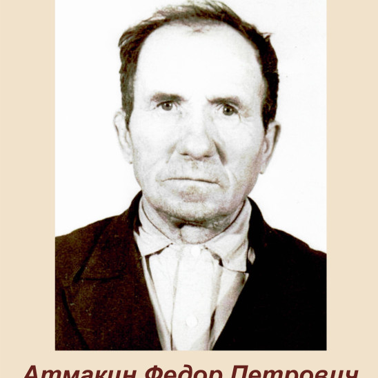 Боевой путь ветерана Атмакин Федор Петрович находился со дня формирования в 367 стрелковой Краснозаменной дивизии. С декабря 1941 участвовал в боях на Карельском фронте в составе 1217 стрелкового полка в должности стрелка-автоматчика роты автоматчиков. Участвовал в оборонительных боях в районе станции Массельская, принимал участие в разведывательных поисках. В 1944 году, во время наступательных боев по освобождению Советского Заполярья в районе поселка Никель у высоты 441,4 Атмакин Ф.П. был ранен. За особые заслуги награжден медалью "За оборону Советского Заполярья". После ранения прибыл в свой полк, по ходатайству подполковника 1217 стрелкового полка Тищенко был представлен и награжден медалью "За боевые заслуги".