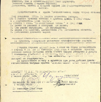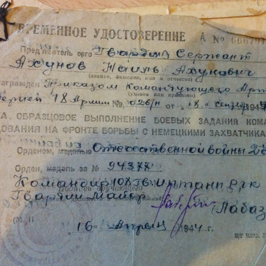 Ахунов Наиль Ахунович - мой прадед.Родился в Татарской АССР, Елабужский р-н, д.Вотский Юраш в 1918 году. До войны работал учителем математики и родного языка в 5-7 классах в Н6Ш №21 г. Магнитогорска, Кировского района с 1937 по 1940гг., уволился по призыву в ряды Красной Армии.Командир орудия 108 Новороссийского гвардейского истребительного противотанкового артиллерийского полка. Под командованием полковника Д.Л. Маргулиса участвовал в разгроме окружённой Корсунь-Шевченковской группировки фашистов.Был убит в бою 19 июля 1944г. в г. Артасов, Нестеровского р-н, Львовской обл., Украина.Место захоронения: Украинская ССР, Львовская обл., Куликовский р-н, с. Дзибульки, юго-западная окраина.Кавалер ордена Отечественной войны 2-ой степени №94377. Также есть упоминание о том же ордене годом ранее в письме командира части, героя Советского Союза гвардии полковника Д.Л. Маргулиса к моей прабабушке с призывом "Гордиться своим мужем".Его имя увековечено в мемориале у Вечного огня в г. Елабуга.К сожалению, все мои знания о жизни прадеда - лишь сохранённые прабабушкой и дедом письма и документы с единственной сохранившейся фотографией, сделанной ещё до войны. И всё же я чувствую связь с этим человеком, ведь 3 поколения, включая меня, своим математическим складом ума и выбранными профессиями обязаны именно ему, не говоря уже о внешнем сходстве, что поразительно для семьи с диким смешением кровей.