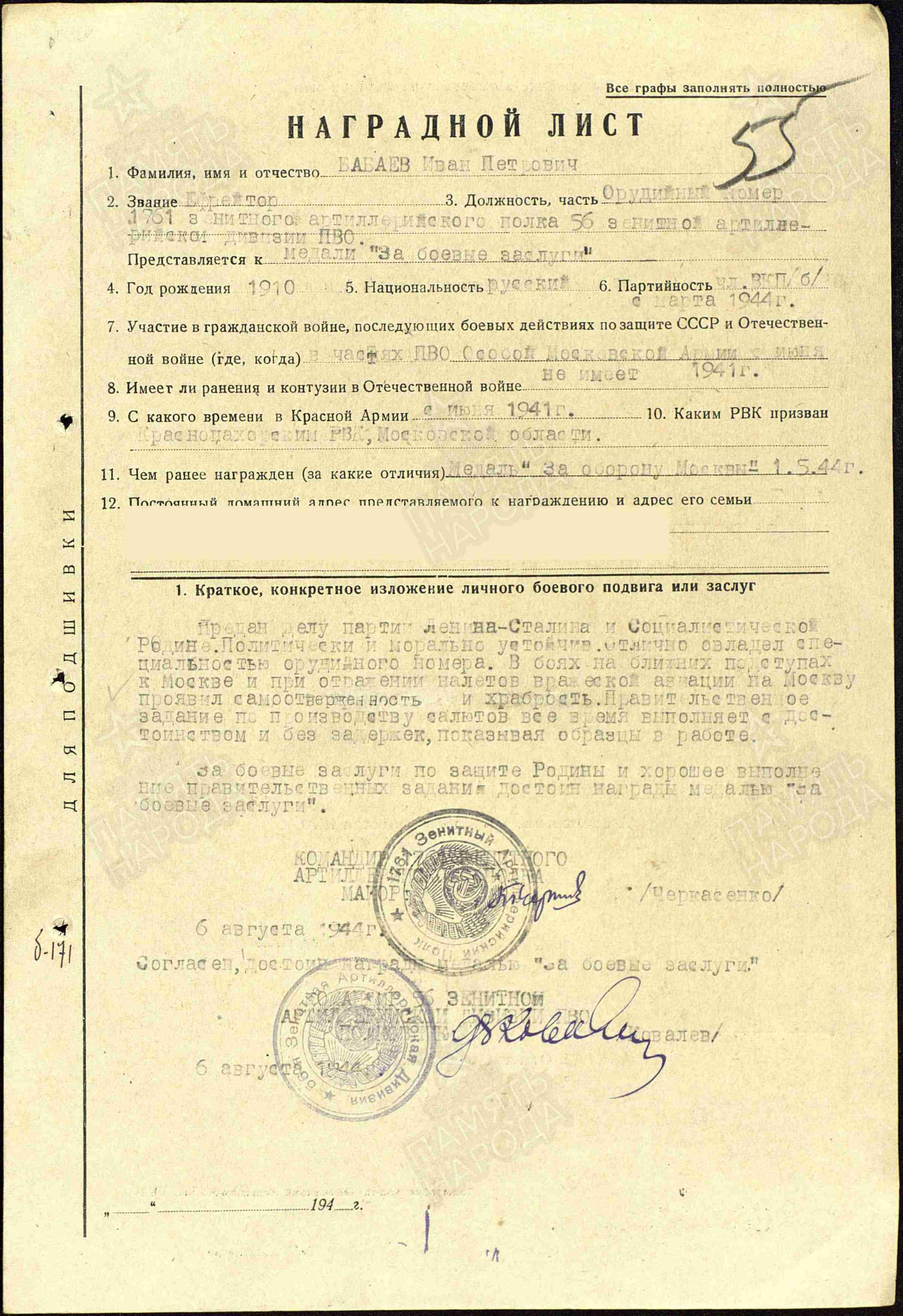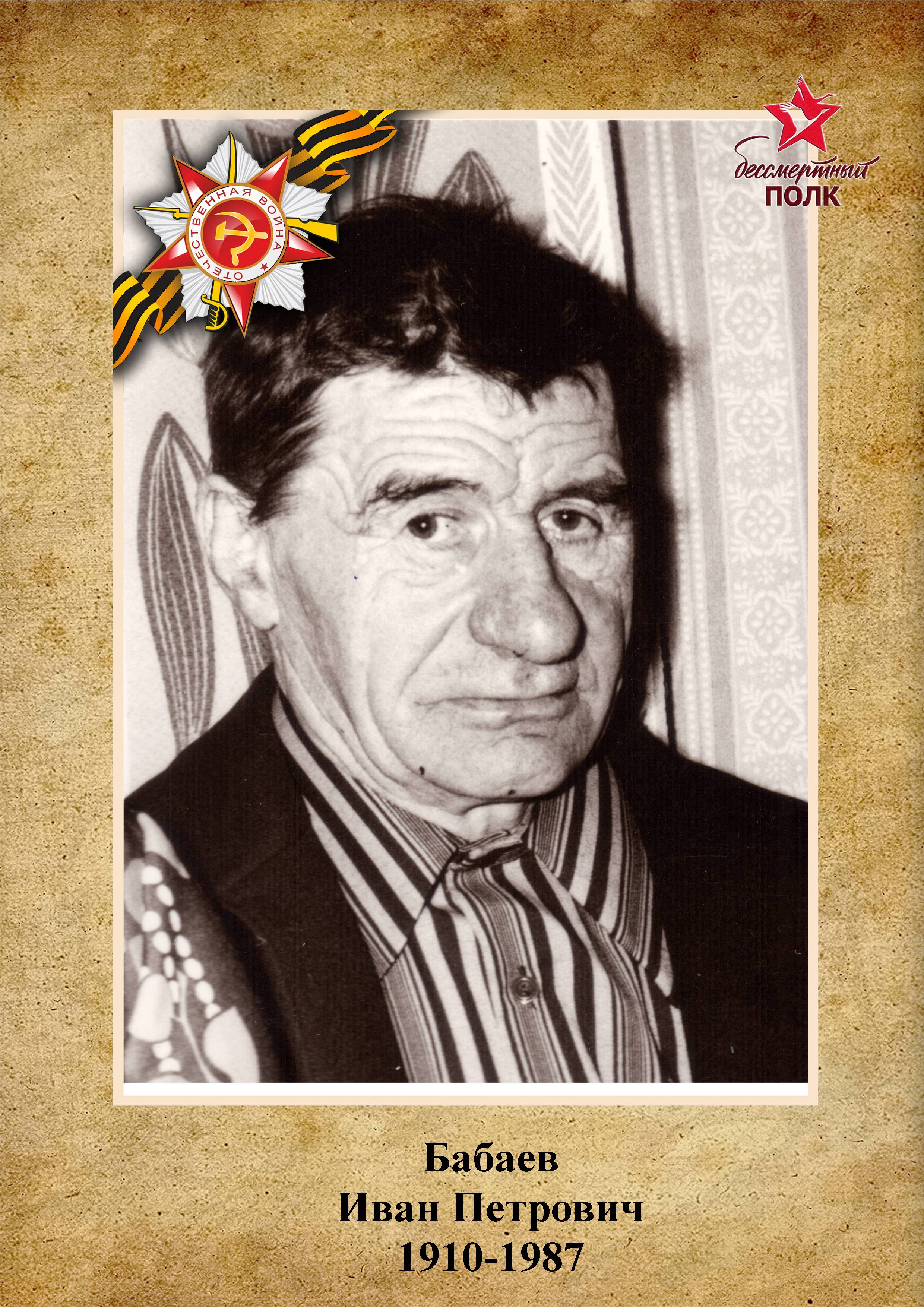 Мой дедушка Иван Петрович Бабаев родился в 1910 году в деревне Спас-Купля Московской области. Со своей будущей женой познакомился в поле. Оба работали трактористами. Клавдия была моложе на 9 лет, но это не помешало счастью молодых. В мае 1938 года они поженились. Через год родился сын Сергей, ещё через два - Алексей. Дедушка продолжал трудиться, бабушка - занималась детьми. Война, июнь 1941 года. Дедушку мобилизовали сразу, в июне 1941 года. С 23 июня 1941 года в армию призывали военнообязанных от 1905 по 1918 год рождения включительно. Отец, Пётр Васильевич, 1879 г.р., и младшие братья не подходили по возрасту. Дедушку направили в войска противовоздушной обороны зенитчиком. Очень переживал за семью. Ведь осенью 1941 года рядом с родной деревней проходила линия фронта. Всю войну он сражался за Москву на Волоколамском направлении. Не обошлось без ранений и контузий. В 1944 году награжден медалями "За оборону Москвы" и "За боевые заслуги". В наградном листе к медали "За боевые заслуги" отмечено, что дедушка отлично овладел специальностью орудийного номера. В боях на ближних подступах к Москве и при отражении налетов вражеской авиации на Москву проявил самоотверженность и храбрость. Также был награжден медалью «За победу над Германией в Великой Отечественной войне 1941—1945 гг.» и орденом Отечественной войны II степени, 1985г. После войны дедушка продолжил работать трактористом в Вороновской машино-тракторной станции, а потом в совхозе. Вместе с другими передовиками участвовал в параде на Красной площади в 1967 году. Встречался в памятные даты с другими земляками-участниками войны, но дома никому не рассказывал о фронтовых буднях. Всего у дедушки и бабушки было 5 сыновей, среднего из которых назвали Николаем в память о младшем брате дедушки, погибшем в сентябре 1943 года в боях под Смоленском. Дедушка был скромным человеком, трудолюбивым, исполнительным. Очень любил свою семью. Умер 3 января 1987 года. На фотографии за рулем трактора дедушке 43 года. Более ранних фотографий не сохранилось.