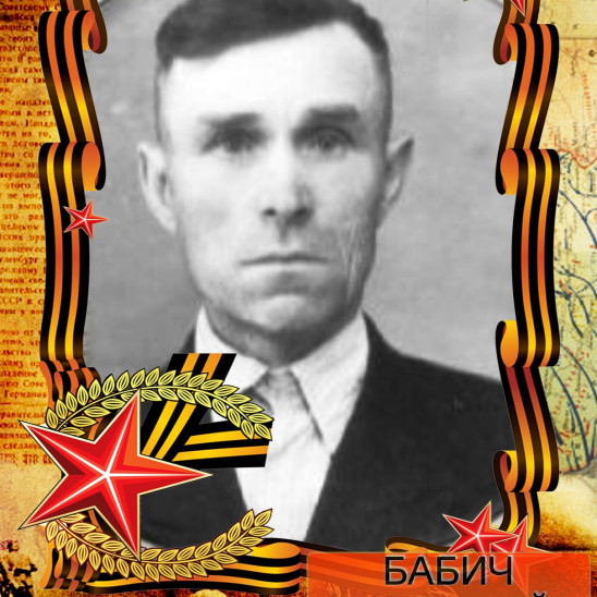 Бабич Григорий Алексеевич родился на хуторе Калитва Воронежской области, Ладомировского района 10 января 1907 года. Женился в 1931 году на Костыря Елене Михеевне (брак зарегистрирован в 1949 г.) В 1931 году в семье Бабич родился сын Иван, в 1934 году сын Николай. В 1934 году в Воронежской области был голод, семья Бабич переехала на Кубань. Жили в станице Кавказская на улице 3-й Интернационал 58 (ныне улица. Малиновского 186). Довоенные годы работал в артеле (колхоз) "1 - Мая". В1937 году родился сын Владимир, в 1940 году Виктор. В возрасте 34 лет (16.08.1941г) Григорий Алексеевич был призван Кропоткинским РВК, служил в 600-м строевом полку. 20.08.1941г. участвовал в боях за город Киев. Получил ранение в левую ногу. Лежал в госпитале с 29 октября по 21 декабря 1941года. 10.02.1942г. переведен в 986-ой строевой полк, участвовал в боях за город Ямы. В 1943 году родился сын Анатолий. С 22.09.1944г. служил в 233 полку КВ НКВД в автороте в звании красноармеец слесарь. После войны Григорий Алексеевич работал в колхозе "Путь к коммунизму". 1 декабря 1973 года присвоено звание "Заслуженный колхозник" сельскохозяйственной артели. Умер Григорий Алексеевич в ст. Кавказская, в возрасте 82 лет, 21 ноября 1989г.