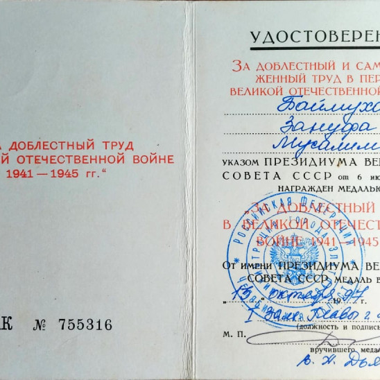Баймухаметова Зануфа Мусалимовна родилась в семье бедных крестьян 25 августа 1927 года в маленьком домике на окраине деревни Таймеево Салаватского района Башкирской АССР. Детей в семье было семеро. Зануфа Мусалимовна - самая старшая. Детство было тяжелое, голодное. Но, не смотря на все трудности, в 1934 году она пошла в школу. В 1941 году окончила седьмой класс. Началась война. Отца сразу же забрали на фронт. А маме семерых детей не прокормить. Вот тогда и пришлось Зануфе Мусалимовне в свои 14 лет пойти на работу. Ведь она в семье старшая. Забота о младших братьях и сестренках, любовь к ним придавали ей силы. Маленькая, хрупкая девочка выходила наравне с взрослыми в поле на уборку урожая, нанималась в работники: пилила дрова, возила из леса на лошадях, умела запрягать лошадей. Голодное, холодное военное детство не породило злость и ненависть в ее юной душе, а напротив забота о людях, любовь к близким все крепла. В 1948 году Зануфа Мусалимовна вышла замуж и переехала вместе с мужем, Рауфом Хужиевичем, в деревню Саргамыш. Работала дояркой на ферме. На работу уходила рано утром, возвращалась поздно вечером. Между дойками успевала покос убирать. 1 мая 1949 года родился сын-первенец Дулкын. Родила его Зануфа Мусалимовна прямо на ферме во время дойки. В то тяжелое время не приходилось сидеть дома с детьми. На следующее утро, оставив сына с мамой, снова пошла на работу. Муж тоже работал с утра до вечера столяром. Семья была дружная. Вечером, вернувшись с работы, уставшие, вместе убирались по хозяйству. Позже в этой замечательной трудовой семье родилось еще четыре дочери: Клара - 1950 г.р., Айсылу - 1952 г.р., Айгуль - 1954 г.р., Алмира- 1958г.р. В 1959 году Зануфа Мусалимовна награждена медалью Материнства 2 степени. Воспитанием детей занимались вместе с мужем. Муж очень любил читать и привил любовь к чтению детям. В доме было много книг. Муж приносил с работы детские книжки, «Весёлые картинки», дети ждали с нетерпением вечера. Глаза у всех радостно блестели, от души смеялись задорным смехом, ласково хлопали друг друга по плечу, когда муж рассказывал детям весёлые истории. Вечерами читали по очереди детские книжки, а Зануфа Мусалимовна, тем временем, шила на заказ и вязала шали на продажу, чтобы заработать хоть немного денег. Зарплата была маленькой, денег не хватало. Приходилось садить много картофеля, дети помогали на огороде. Осенью сдавали урожай в совхоз, на вырученные деньги покупали детям одежду и обувь. Сладости дети видели только по большим праздникам, купить было не на что. В бедной, но дружной семье Баймухаметовых царили любовь, уважение, взаимопонимание, стремление к поставленной цели, лучшей жизни, к учебе. В 1988 году Зануфа Мусалимовна с мужем переехали в г. Златоуст, поближе к детям. В 1993 году заболел муж. Война и голодное детство дали о себе знать. Врачи поставили диагноз: рак желудка. Это был приговор. В тот же год Рауф Хужиевич умер. Зануфа Мусалимовна осталась одна в своем доме. Но дети не забывали её. Вместе с восьмью внуками и восьмью правнуками навещали Зануфу Мусалимовну, помогали ей. Часто собирались большой дружной семьей в уютном родительском доме. Когда Зануфе Мусалимовне исполнилось семьдесят три года, дочь Айгуль предложила ей переехать в посёлок Бердяуш, поближе к себе. Так с 2000 года Зануфа Мусалимовна живет в Бердяуше в частном доме в центре поселка. Вдов