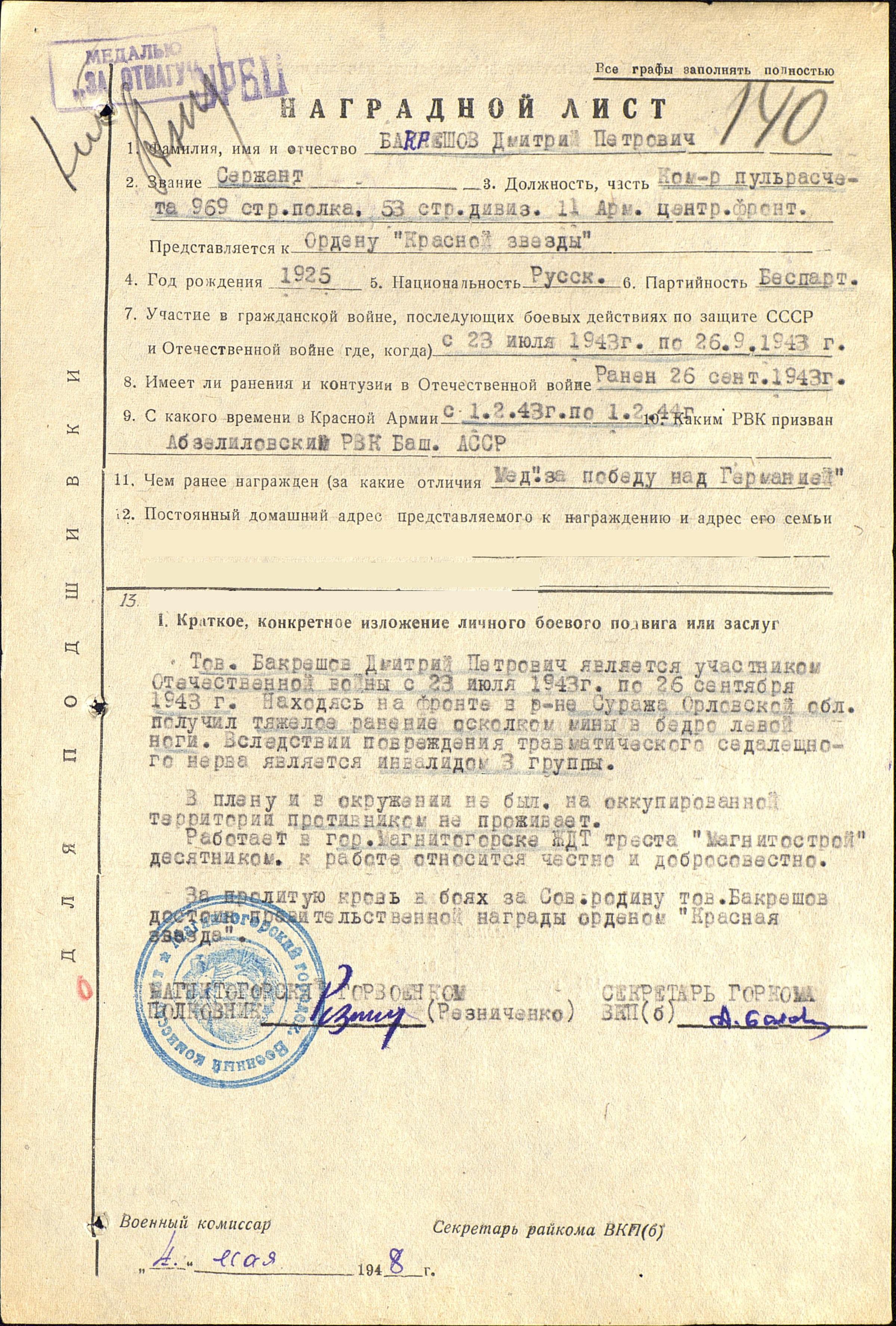 Наш Дедушка и Папа - Бакрышев Дмитрий Петрович родился 6 ноября 1925 года в г.Магнитогорске Челябинской области Был участником Великой Отечественной войны с июля 1943 года. В бою в районе Сурожа Орловской области получил тяжелое ранение осколком мины в бедро левой ноги с повреждением седалищного нерва. Позже получил инвалидность. Награжден медалью «За Отвагу».В бою его ранило в ногу , и когда немецкие солдаты после боя обходили-проверяли не остался ли кто живой, подошли и к нему. Солдат сильно пнул его ботинком в раненую ногу-откуда нашлись силы у 17 летнего мальчишки , чтобы не только не закричать, а не подать признаков жизни. Потом его нашла санитарка девушка. После ранения он всю жизнь прихрамывал.Еще осколок остался на переносице возле глаза, оперировать там его было нельзя. После войны работал он в Магнитогорске в лагере военнопленных, пока этот лагерь не расформировали. После он перевелся работать дежурным по жд станции Магнитогорск. В то время начали строить продолжение ветки в Сибай и его , как высокоинициативного и ответственного человека перевели на работу в Сибай. Работал в отделе кадров. Состоял в руководстве профсоюза. Его несчерпаемая жизенная энергия и воля постоянно двигали все, с чем он был связан,как на работе так и в семье. Был очень жизнерадостным,» душой « любой компании, очень любил шутить. Его все интересовало,любая техника, любые новинки, собирал модели фотоаппаратов, транзисторов-радиоприемников-а потом с удовольствием их дарил близким и знакомым.Очень любил детей,очень любил жизнь. После небольшого отпуска в Крыму-он за неделю собрался вместе с семьей и переехал в Крым под Симферополь в августе 1974 года,где прожил совсем недолго-2 года. Одно его всегда огорчало, что из-за войны не смог получить образование, поэтому сделал все для того, чтобы его дети выучились.Мечтал , чтобы его сын стал военным. Сын осуществил его мечту, но уже после его смерти.
