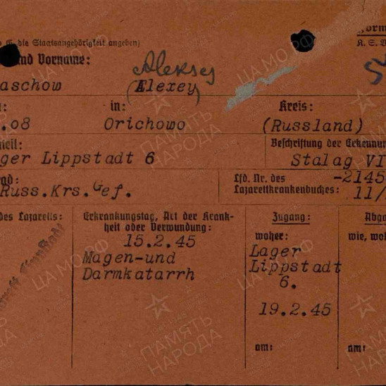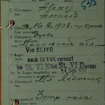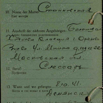 Наш герой родился в г.Орехово-Зуево 16 февраля 1908 года. Окончил 5 классов Средней школы 31 в г.Орехово-Зуево в 1920г.Являлся рабочим, по специальности слесарь. призван по мобилизации Орехово-Зуевским ГВК Московской области 7,7,1941 году.1-я Ленинская стрелковая дивизия (Стрелок).с 7,7,1941 по 8,10,1941 год. Находился в плену в Германии с 8,10,1941 по 3,5,1945.Призван полевым военкоматом действующей армии 3,5,1945. Это 444 стрелковый полк. Демобилизован на основании Указа Президента Верховного Совета СССР от 25,9,1945.