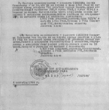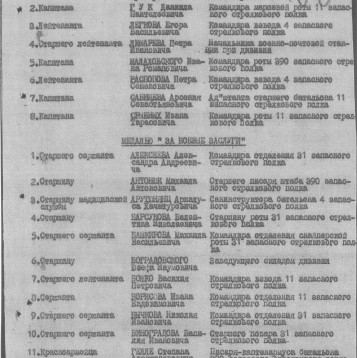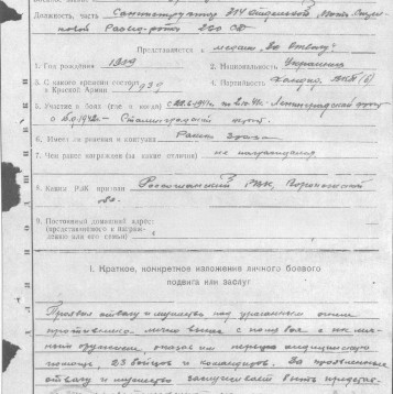 Сан-инструктор 314 отдельной Мот. Стрелковой Развед-роты 260 Стрелковой Дивизии. Проявил отвагу и мужество. Над ураганным огнем противника лично вынес с поля боя с их личным оружием, оказав первую медицинскую помощь, 23 бойца и командира. За проявленную отвагу и мужество заслуживает быть представленным к награде "Медаль За Отвагу"