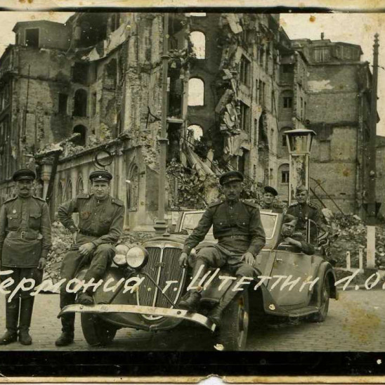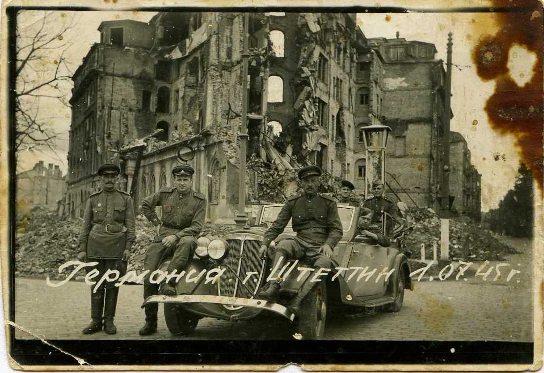 частями Советской Армии Барышев Павел Яковлевич дошел до Берлина. На фотографии он слева на фоне разрушенных домов города Штеттин в Германии и трофейного немецкого автомобиля 1 июля 1945 года.