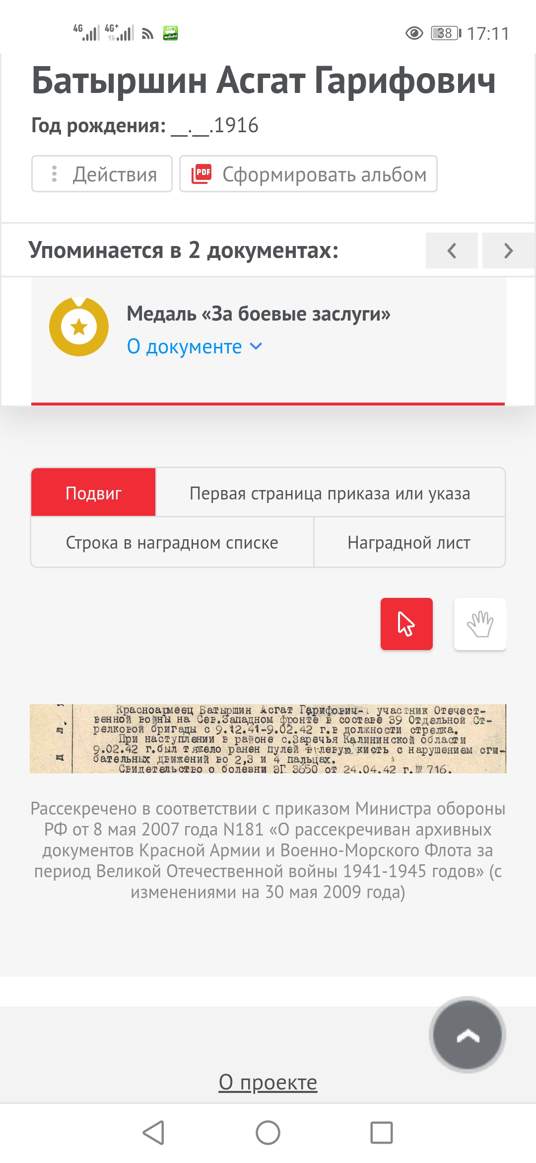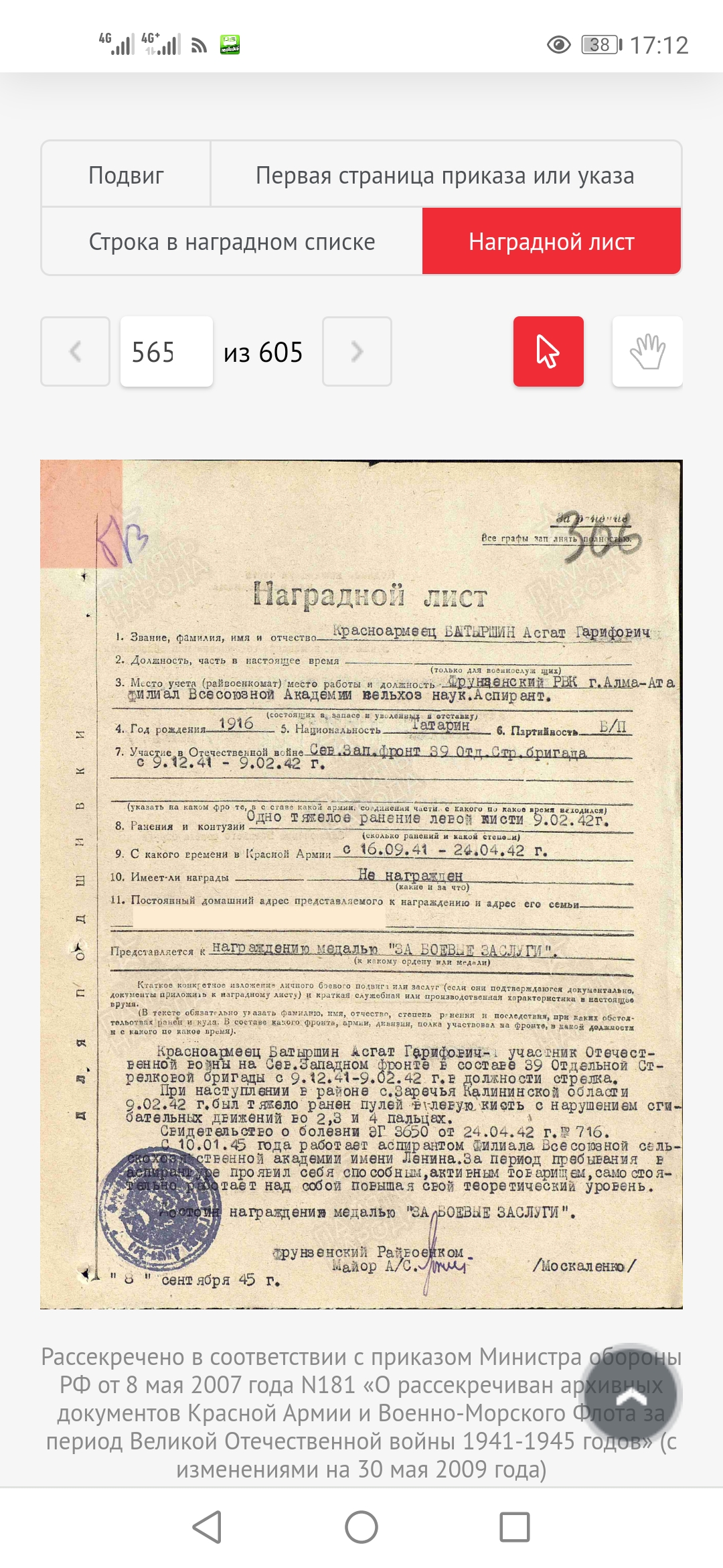 Красноармеец Батыршин Асгат Гарифович родился в 1916 году. В ряды Красной Армии призван Фрунзенским РВК г.Алма-Ата. 39-я Стрелковая Бригада сформирована по директиве НКО и согласно приказа командующему войсками Среднеазиатского военного округа об отправке 34-й и 39-й стрелковых бригад, направлена в распоряжение командующего войсками Московской зоны обороны. В составе 39-й отдельной стрелковой бригады сформированной в Алма-Ате осенью 1941-го года Батыршин А.Г. был участником битвы под Москвой и на Северо-Западном фронте в должности стрелка. https://rkka.wiki/index.php/39_%D1%81%D1%82%D1%80%D0%B5%D0%BB%D0%BA%D0%BE%D0%B2%D0%B0%D1%8F_%D0%B1%D1%80%D0%B8%D0%B3%D0%B0%D0%B4%D0%B0_(I_%D1%84%D0%BE%D1%80%D0%BC%D0%B8%D1%80%D0%BE%D0%B2%D0%B0%D0%BD%D0%B8%D1%8F) https://pamyat-naroda.ru/warunit/id332/ Бригада прошедшая боевой путь - 400 км упорных, ожесточенных боев с фашисткими захватчиками и выведенной на переформирование в район ст.Савелово оставила яркий след который фактически известен соратникам Асгата Гарифовича, а нам из архивных документов. Формировал 39-ю отдельную стрелковую бригаду полковник Позняк Виктор Генрихович. Его, Героя Советского Союза, генерала-лейтенанта в отставке, профессора, воспоминания, приведены в книге "Вспомним, товарищ...", изданной в Казахстане в 1987 году. При наступлении в районе с. Заречья Калининской области 9 февраля 1942 года Асгат Гарифович был тяжело ранен.Боевые традиции 39-й отдельной Стрелковой Бригады крепко хранятся бойцами, командирами и полит-работниками 88 стрелковой Дивизии в которую она была преобразована. Дивизия, прошла славный путь от Калининской области до Чехословакии. Всюду, где сражалась эта дивизия, ее воины проявляли стойкость, мужество и храбрость, более 20 тыс. человек награждены орденами и медалями. Батыршин А.Г. награжден медалью "За боевые заслуги", а с 1945 года являлся аспирантом Всесоюзной сельскохозяйственной академии имени Ленина и разработал множество необходимых для послевоенных лет машин, используемых в сельском хозяйстве возрождающейся страны https://pamyat-naroda.ru/heroes/podvig-chelovek_nagrazhdenie80142952/?backurl=%2Fheroes%2F%3Flast_name%3D%D0%91%D0%B0%D1%82%D1%8B%D1%80%D1%88%D0%B8%D0%BD%26first_name%3D%D0%90%D1%81%D0%B3%D0%B0%D1%82%26group%3Dall%26types%3Dpamyat_commander%3Anagrady_nagrad_doc%3Anagrady_uchet_kartoteka%3Anagrady_ubilein_kartoteka%3Apdv_kart_in%3Apdv_kart_in_inostranec%3Apamyat_voenkomat%3Apotery_vpp%3Apamyat_zsp_parts%3Akld_ran%3Akld_bolezn%3Akld_polit%3Akld_upk%3Akld_vmf%3Akld_partizan%3Apotery_doneseniya_o_poteryah%3Apotery_gospitali%3Apotery_utochenie_poter%3Apotery_spiski_zahoroneniy%3Apotery_voennoplen%3Apotery_iskluchenie_iz_spiskov%3Apotery_kartoteki%3Apotery_rvk_extra%3Apotery_isp_extra%3Asame_doroga%26page%3D1%26grouppersons%3D1&search_view_id=podvigchelovek_nagrazhdenie80142952 https://pamyat-naroda.ru/heroes/memorial-chelovek_vpp1995116188/?backurl=%2Fheroes%2F%3Flast_name%3D%D0%91%D0%B0%D1%82%D1%8B%D1%80%D1%88%D0%B8%D0%BD%26first_name%3D%D0%90%D1%81%D0%B3%D0%B0%D1%82%26group%3Dall%26types%3Dpamyat_commander%3Anagrady_nagrad_doc%3Anagrady_uchet_kartoteka%3Anagrady_ubilein_kartoteka%3Apdv_kart_in%3Apdv_kart_in_inostranec%3Apamyat_voenkomat%3Apotery_vpp%3Apamyat_zsp_parts%3Akld_ran%3Akld_bolezn%3Akld_polit%3Akld_upk%3Akld_vmf%3Akld_partizan%3Apotery_doneseniya_o_poteryah%3Apotery_gospitali%3Apotery_utochenie_poter%3Apotery_spiski_zahoroneniy%3Apotery_voennoplen%3Apotery_iskluchenie_iz_spiskov%3Apotery_kartoteki%3Apotery_rvk_extra%3Apotery_isp_extra%3Asame_doroga%26page%3D1%26grouppersons%3D1& https://pamyat-naroda.ru/heroes/podvig-chelovek_nagrazhdenie80142952/?backurl=%2Fheroes%2F%3Flast_name%3D%D0%91%D0%B0%D1%82%D1%8B%D1%80%D1%88%D0%B8%D0%BD%26first_name%3D%D0%90%D1%81%D0%B3%D0%B0%D1%82%26group%3Dall%26types%3Dpamyat_commander%3Anagrady_nagrad_doc%3Anagrady_uchet_kartoteka%3Anagrady_ubilein_kartoteka%3Apdv_kart_in%3Apdv_kart_in_inostranec%3Apamyat_voenkomat%3Apotery_vpp%3Apamyat_zsp_parts%3Akld_ran%3Akld_bolezn%3Akld_polit%3Akld_upk%3Akld_vmf%3Akld_partizan%3Apotery_doneseniya_o_poteryah%3Apotery_gospitali%3Apotery_utochenie_poter%3Apotery_spiski_zahoroneniy%3Apotery_voennoplen%3Apotery_iskluchenie_iz_spiskov%3Apotery_kartoteki%3Apotery_rvk_extra%3Apotery_isp_extra%3Asame_doroga%26page%3D1%26grouppersons%3D1&search_view_id=podvigchelovek_nagrazhdenie80142952 Вместе с фотографией присоединяю карты боевого пути Битвы за Москву Память всем Воинам и спасибо за то, что отстояли 